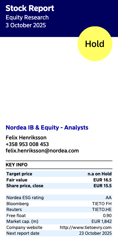 Nordea julkaisi päivitetyn Tietoevry-analyysinsä. Fair value nousee 16,50 euroon (edellinen: 16,00 €), suositus pysyy PIDÄ-tasolla. ![]()