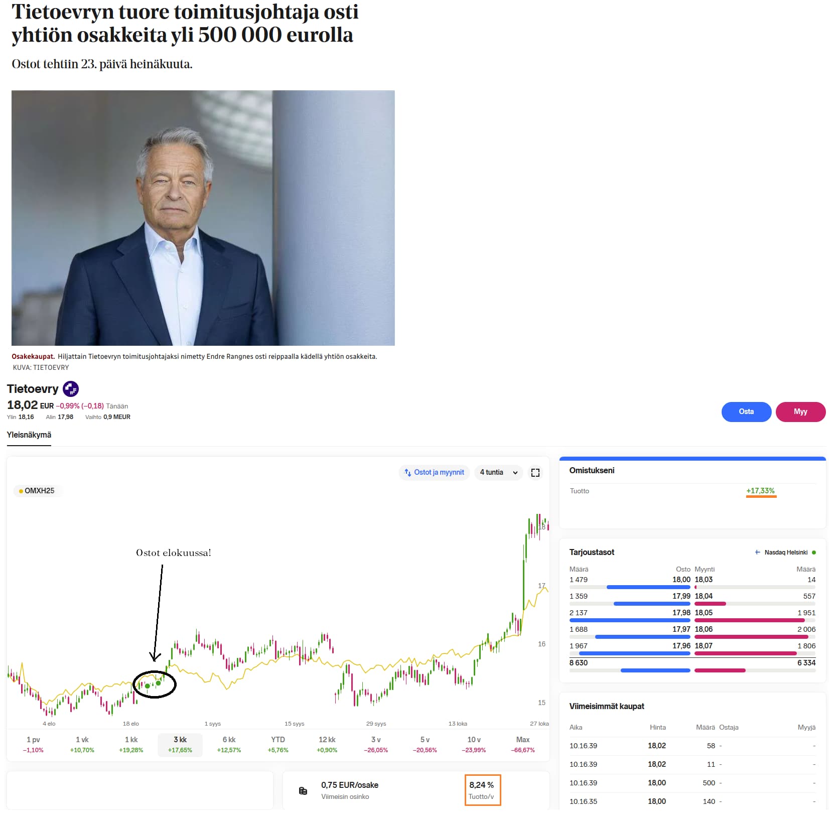 Jeg tænkte selv på at følge TietoEvrys nye administrerende direktør Endre Rangnes, og det gjorde jeg så. Den nye adm. direktør investerede over en halv million af sine egne penge i TietoEvry-aktier i juli. Det er gået godt. Overafkast i forhold til HEX25-indekset, og et efterårsudbytte er allerede faldet ind på kontoen med en udbytteprocent på ~9% Bemærk. Ikke en købsanbefaling -