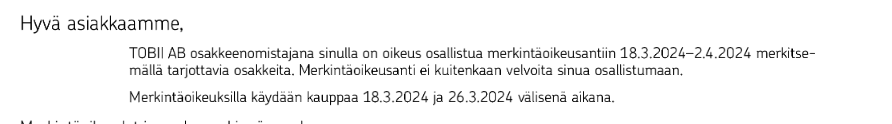 Tobii keskusteluissa on ollut kovin hiljaista. Millaisia ajatuksia palstalla herättää Tobii Dynavoxin spin-off? Olisi Joukuuun 3. päivään asti aikaa pilkkiä Tobiasta että saisi kaupan mukana tulevat Dynavoxin osakkeet. Perinteisesti jakaantumisen jälkeen osien summa on > 1, kuinkahan kävisi tässä?