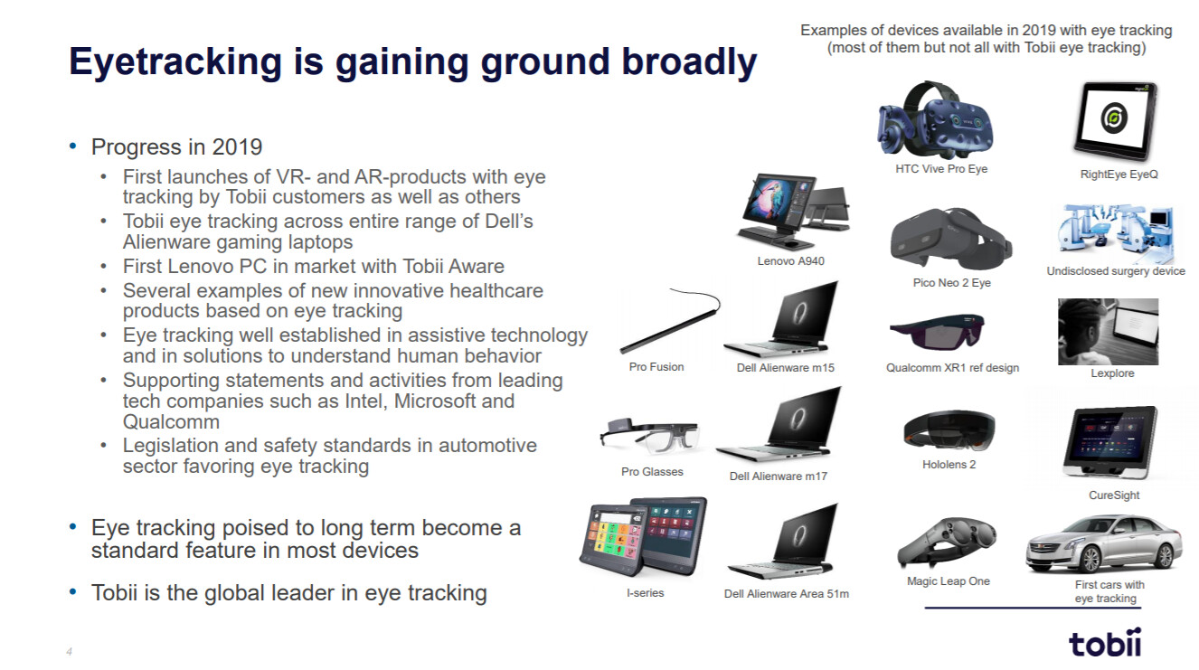 Q4 2019 esityksessä Hololens 2 mainitaan esimerkkinä mutta esitelmä jättää avoimeksi onko siinä Tobiin teknologiaa. “most of [the examples] but not all with Tobii eye tracking”