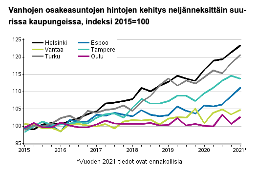 Esimerkiksi Oulun pinta-ala on liki 4 000 neliökilometriä. Hinnat ei nouse 15-20 kilometrin päässä kaupungista, mutta keskustassa ja keskustan tuntumassa on nousua tapahtunut sekä uusissa että vanhoissa. Ja tontteja löytyy hyviltä kasvualueilta helposti.