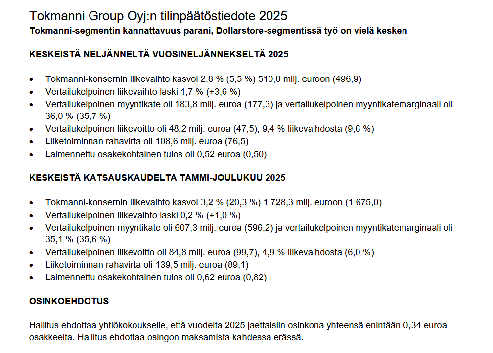 Markkinat olivat pettyneitä Tokmannin tulokseen. Minun odotukseni olivat kai niin alhaalla, että olin positiivisesti yllättynyt parista asiasta. Myyntikate-% parani Q4:llä. Kassavirta oli hyvin vahva.