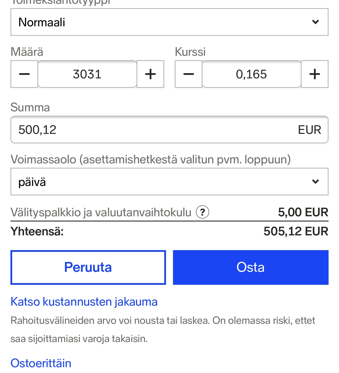 Edit2: joissakin noissa taitaa olla tiukemmat spreadit kuin Nordnet-tuotteissa, eli jos ostaa enemmän, tulee halvemmaksi.