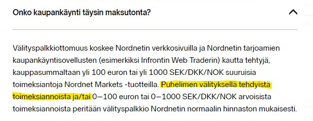 Välityspalkkiottomuus koskee Nordnetin verkkosivuilla ja Nordnetin tarjoamien kaupankäyntisovellusten (esimerkiksi Infrontin Web Traderin) kautta tehtyjä, kauppasummaltaan yli 100 euron tai yli 1000 SEK/DKK/NOK suuruisia toimeksiantoja Nordnet Markets -tuotteilla. Puhelimen välityksellä tehdyistä toimeksiannoista ja/tai 0–100 euron tai 0–1000 SEK/DKK/NOK arvoisista toimeksiannoista peritään välityspalkkio Nordnetin normaalin hinnaston mukaisesti.