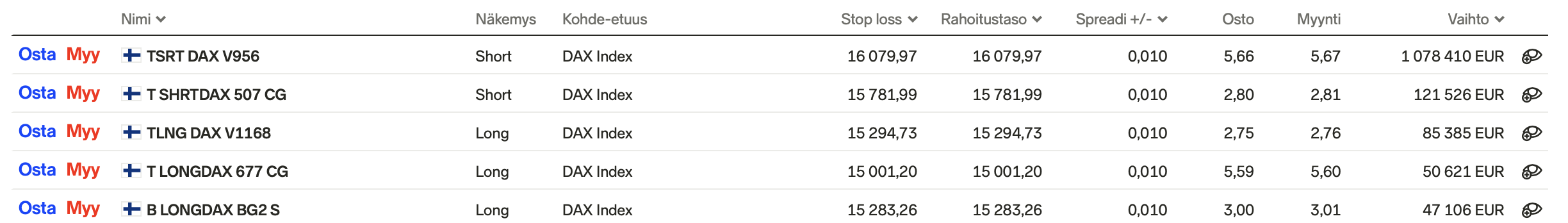 Vipukertoimen saat suunnilleen, kun lasket (kohdeetuuden hinta - rahoitustaso)/kohdeetuuden hinta. Tämä siis jos long. Ja jonkun pienen marginaalin ne siihen kai lisäksi heittävät. Daxilla varmaan luokkaa 25 pistettä.