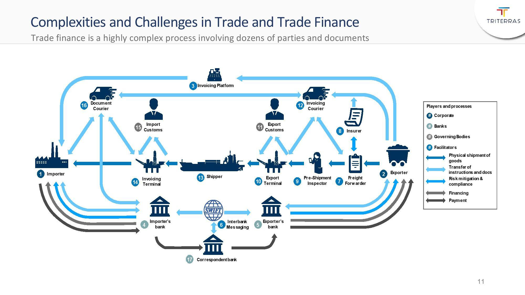 Triterras Inc toimii pienten ja keskisuurten yritysten rahoituksen välittäjänä, kun tavaraa pitää saada liikutettua maasta tai mantereelta toiselle. Isojen pankkien ja rahoituslaitosten kiinnostus pienempään kaupankäyntiin on vähäinen ja riskit rahoittajan toimimiseen liian suuret.