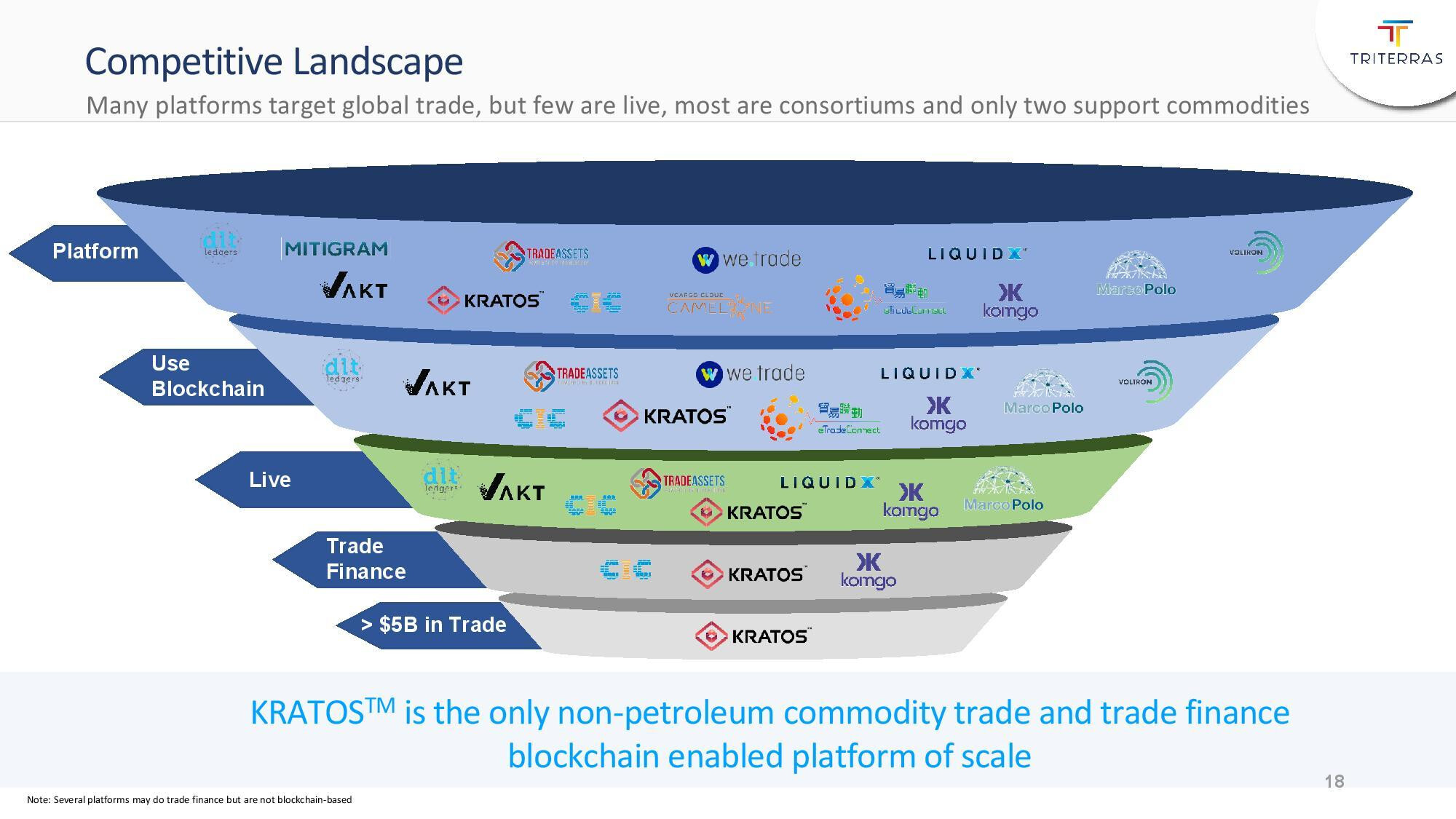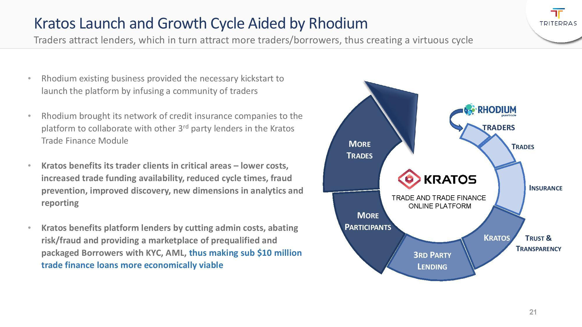 Triterras erbjuder en disruptiv plattform, Kratos, genom vilken betalningar förmedlas från köpare till säljare med hjälp av blockchain-teknik, säkert och utan inblandning av en riskfinansiär. Enligt företaget har betalningar förmedlats för 8,7 miljarder dollar sedan juni 2019, då plattformen togs i bruk.