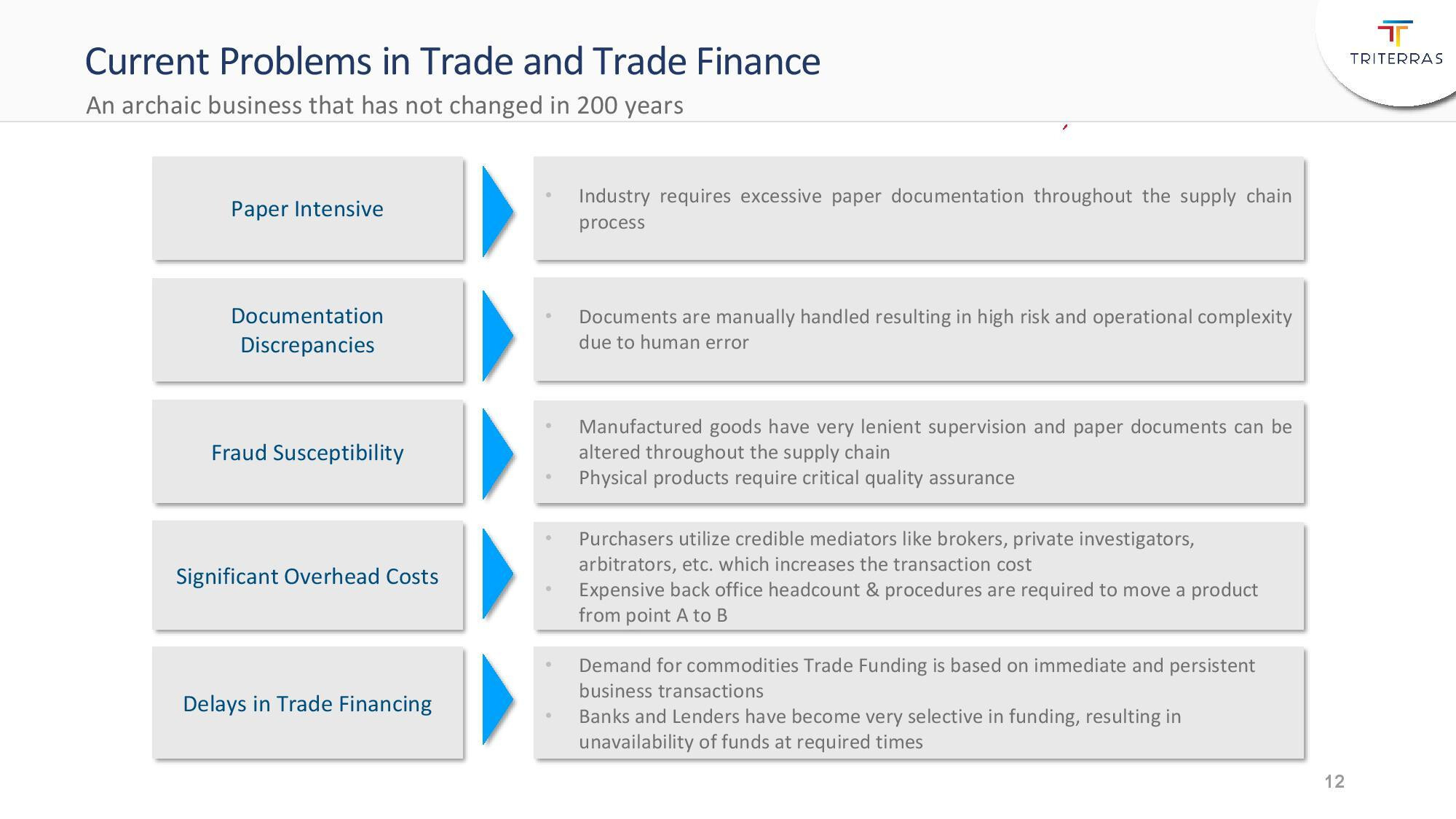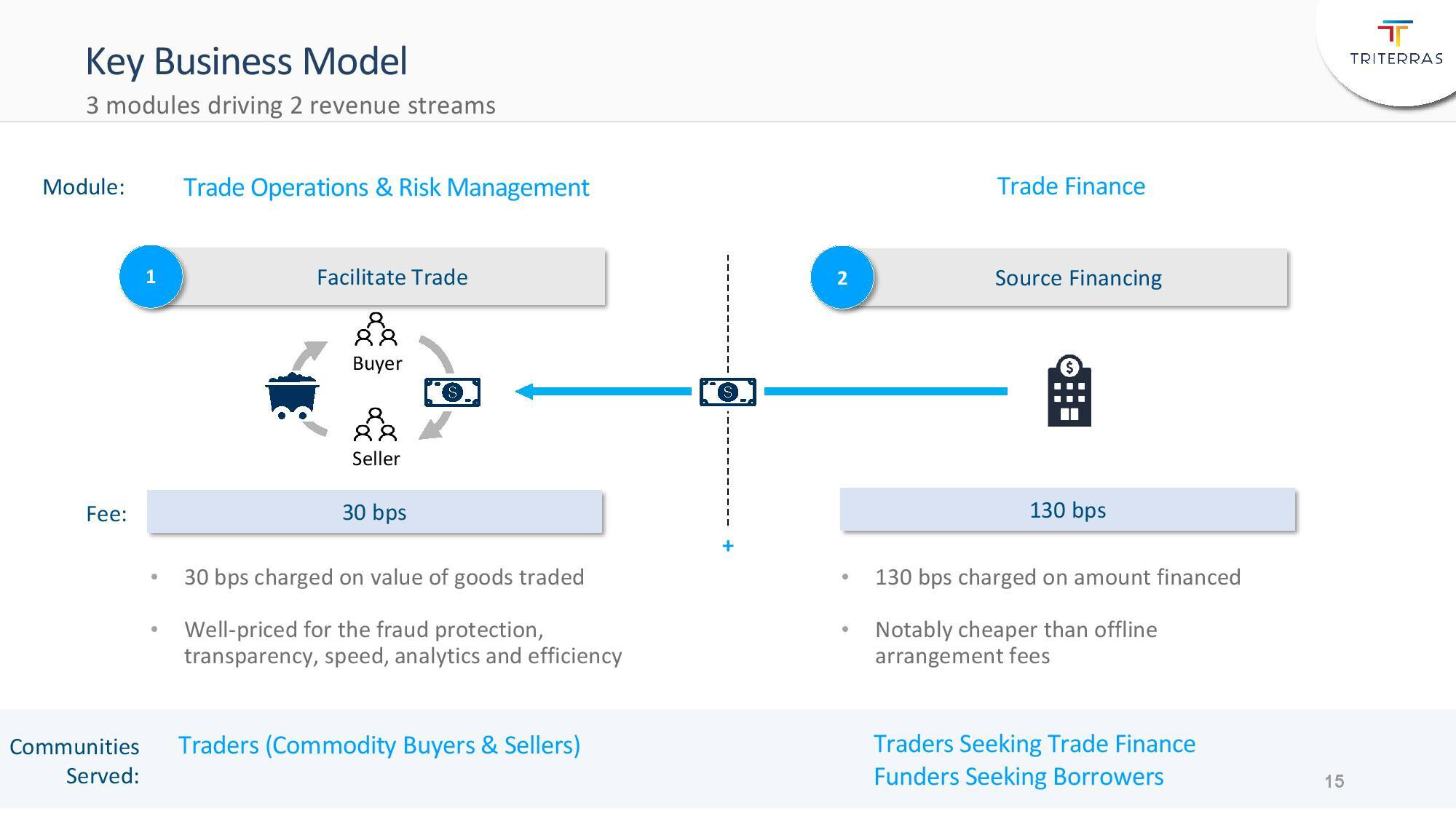 Triterras Inc förmedlar finansiering för små och medelstora företag när varor behöver flyttas från ett land eller en kontinent till en annan. Stora banker och finansinstitut är ointresserade av mindre affärer och riskerna är för stora för att en finansiär ska agera.