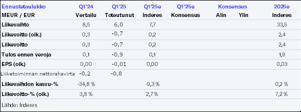 Tulikivis Q1-siffror var lägre än våra prognoser, men den fortsatta tillväxten i orderingången balanserade den övergripande bilden av rapporten. Vägledningen för innevarande år lämnar betydande att ta igen under resten av året, även om skillnaden kommer att börja minskas med en betydligt starkare orderstock än föregående år. Våra prognosändringar var små, vilket resulterade i att vi upprepar vår riktkurs på 0,42 euro och säljrekommendation.