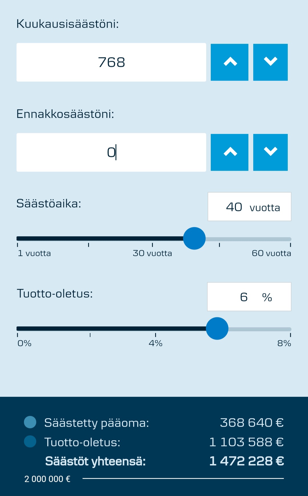 Tuo kuukausittain sijoitettava summa yllä olevassa laskelmassa on 24% bruttopalkasta 3200€/kk eli ~nykyinen eläkemaksu tuon suuruisesta bruttokuukausipalkasta. Kuvassa on nykyhimmelin vaihtoehtoiskustannus.