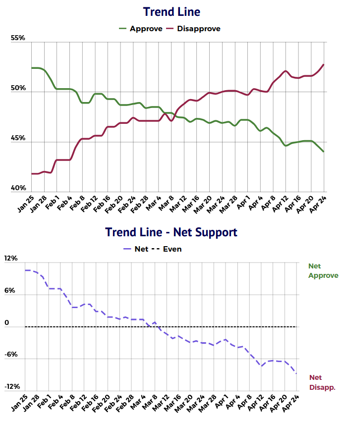 Kyselyissä Trumpin lasku ei ole vielä pysähtynyt, vaan trendi on edelleen tukevasti laskevan puolella. Sikäli kun lasku jatkuu, niin on mielenkiintoista nähdä, missä vaiheessa republikaanit alkavat kokea tämän ongelmaksi. Jos kannatus painuu tarpeeksi alas, niin Trump alkaa muuttua puolueelle painolastiksi. Ehkä 40% ei ole vielä kriittinen raja, mutta alkaisiko jossain 30% paikkeilla pukata jo hikikarpaloita? (Varsinkin, jos tuommoisiin lukemiin päädytään nopealla aikataululla…)