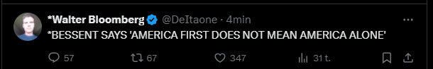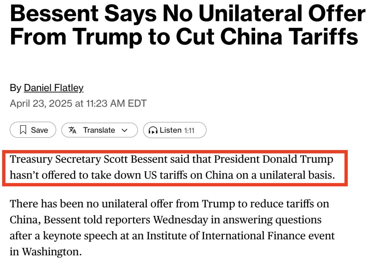 Bessent now saying that President Trump has not offered to take down US tariffs on China on a unilateral basis.