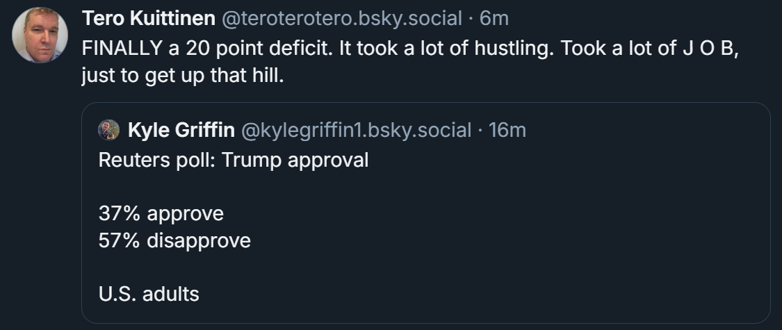 Joku tässä ketjussa kommentoi aiemmin, että pelko Trumpin autoritarismista laskee kun näkee tämän kaiken sekoilun. Tässä voi kenties nähdä sellaista hopeareunusta, vaikka hyökkäys vapaata mediaa vastaan, yliopistoja vastaan yms. ovat jatkuneet samalla kaiken aikaa.