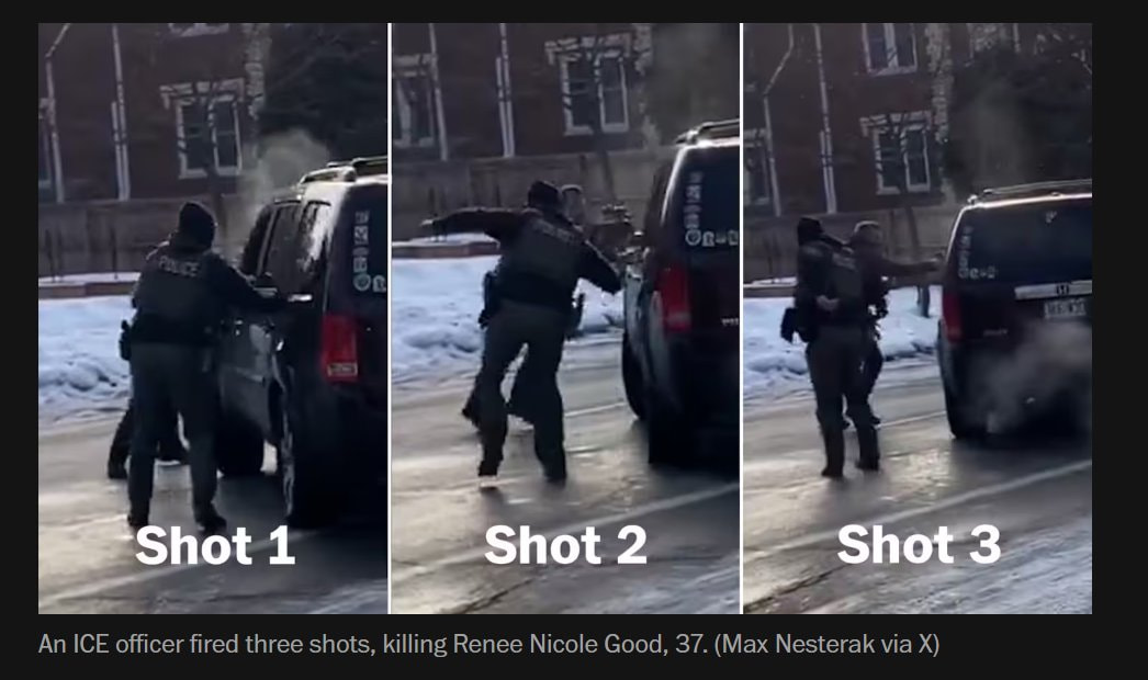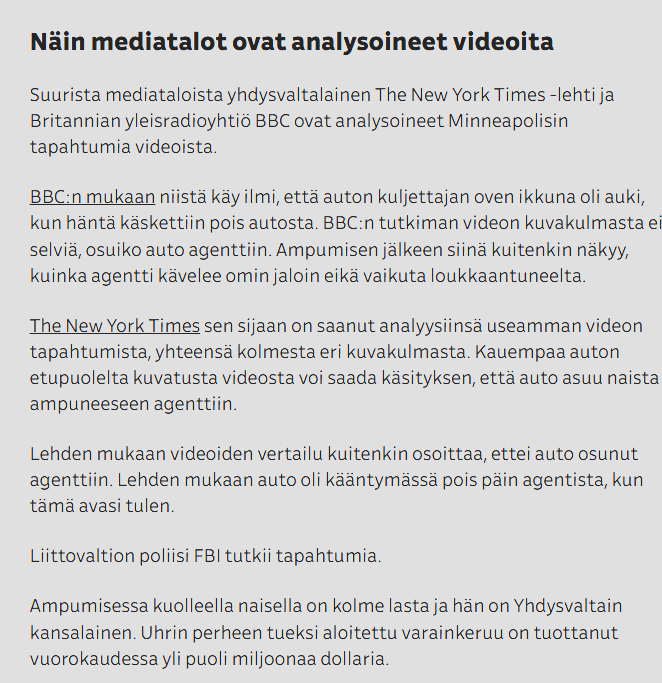 Ei kukaan ole tainnut kieltää etteikö auto olisi osunut tuohon agenttiin. USA:n virallinen kanta on kuitenkin se, että Good pyrki tappamaan ampujan autolla. Lapsikin näkee että se on erittäin värittynyt tapa tulkita noita videoita. Auto lähtee rauhallisesti liikkeelle alle sekunti ennen kuin töytäisee ampujaa. Kuskin huomiota vaativat muutaman sekunnin sisällä sekä vänkärin paikalle pyrkivä kaveri että kuskin ovea aukova ICE-tyyppi. Toki Goodin olisi pitänyt totella ja pitää auto pysähdyksissä mutta ei tuossa kyllä pitäisi millään tavalla täyttyä kriteeristö ammuskelun aloittamiselle.