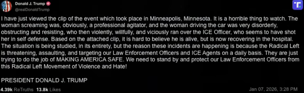 Jos vasemmistomedioista ja valtamedioista saa väärän kuvan, niin tuskinpa siellä oikeistomedian videoissa auton renkaat kääntyvät vasemmalle, mutta silti sekopäistä presidenttiä myöten (videoista huolimatta) aletaan ottamaan saman tien sellaista kantaa, että ampuminen oli itsepuolustusta, koska nainen ei ainoastaan yrittänyt ajaa päälle vaan “violently, willfully and viciously ran over the ICE Officer”.