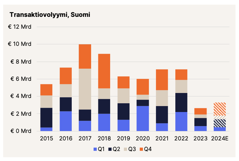 Edellisessä kvartaaliraportissa kirjoitimme, että kiinteistömarkkinan transaktiovolyymi näyttää kvartaalitasolla vakiintuneen 4–5 miljardiin euroon Pohjoismaissa. Monet varmasti toivoivat, että vuoden loppuun olisi kiinteistömarkkinassa saatu pörssitermein “joulupukkiralli”, ja vaikka pientä kiriä nähtiinkin, jäi vuoden 2023 transaktiovolyymi Pohjoismaissa ennustetusti vajaaseen 20 miljardiin euroon. Kyseessä oli hiljaisin vuosi sitten finanssikriisin.