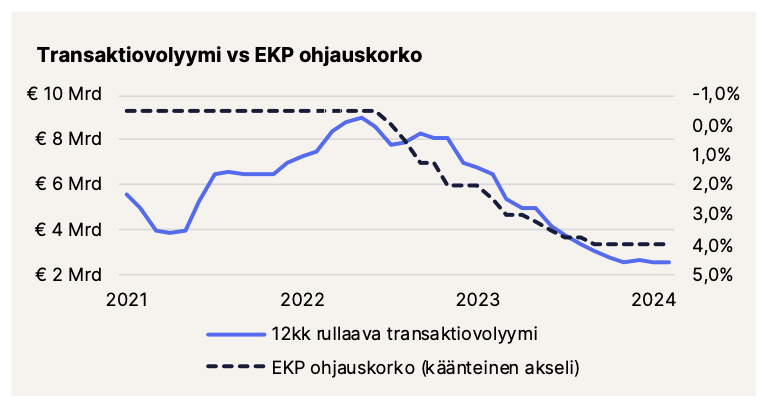 Rahaston edellisissä kvartaalikatsauksissa ja materiaaleissa olemme näyttäneet kansainvälisten konsulttitalojen graafia, jonka mukaan suoran kiinteistömarkkinan käänne tulisi tapahtumaan kuluvan kesän aikana. Euroopan keskuspankin, EKP:n, kesäkuussa tekemä ensimmäinen koronlasku tuleekin todennäköisesti helpottamaan kiinteistöjen arvojen määritystä ja siten tuottojen ennustamista. Jatkossa koronlaskujen vaikutus kiinteistöjen arvoihin voikin olla jo varovaisen positiivinen. Kiinteistömarkkinassa vaikutukset näkyvät hitaiden transaktioprosessien vuoksi verkkaisesti, joten olemme tällä saralla viisaampia todennäköisesti vasta syksyllä.