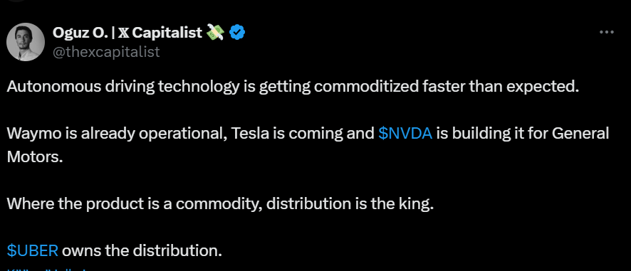 Tviitin sanoma on jotenkin kai tällainen; autonominen ajoteknologia muuttuu selkeästi odotettua nopeammin. Waymo toimii jo, Tesla ja Nvidia vielä kehittävät omansa. Teknologian yleistyessä ratkaisevaa on sen jakelu – ja tämän ketjun yhtiö eli Uber hallitsee sitä.