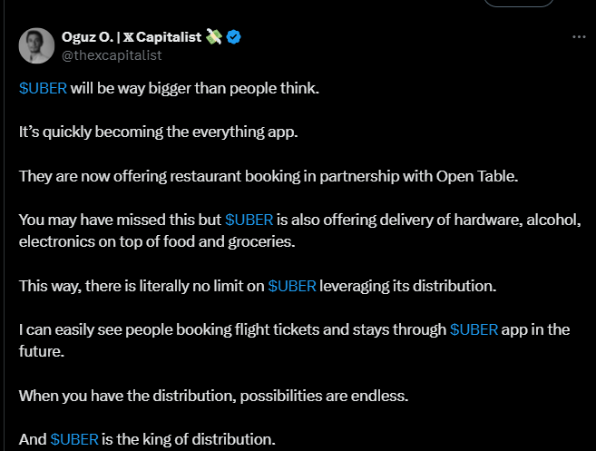 Alla olevassa tviitissä sanotaan, että Uber kasvaa monipuoliseksi sovellukseksi/alustaksi, joka laajenee nopeasti ruoan ja kyytien lisäksi muun muassa ravintolavarauksiin, elektroniikan roinan tilauksiin jne.