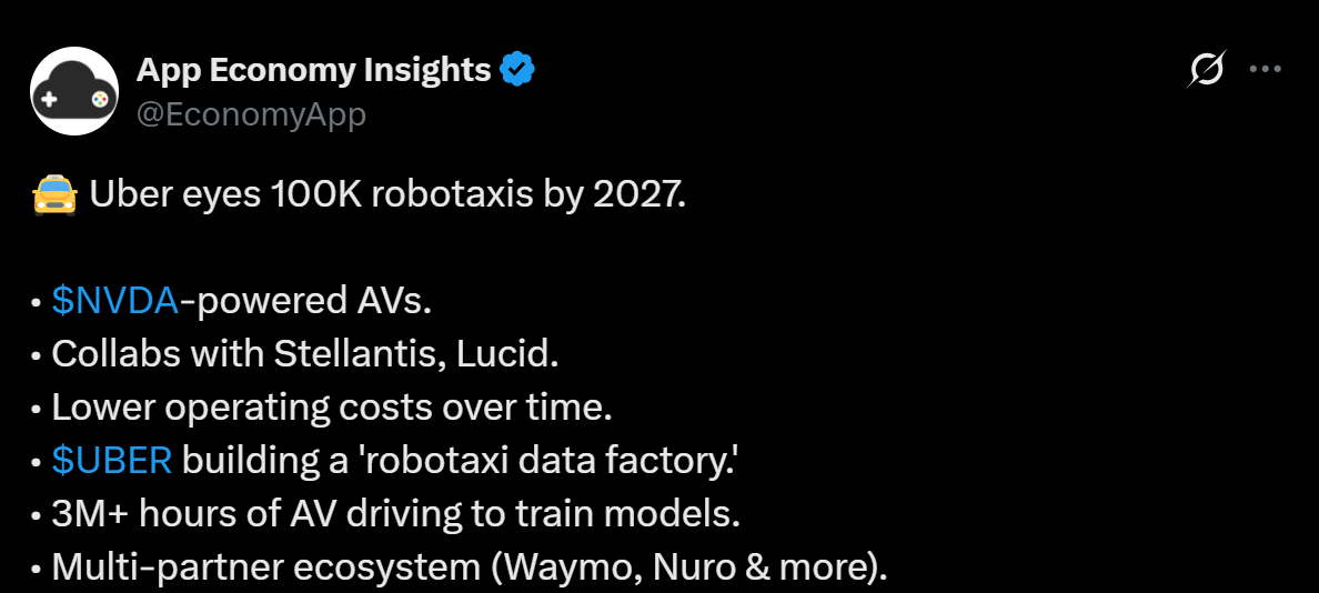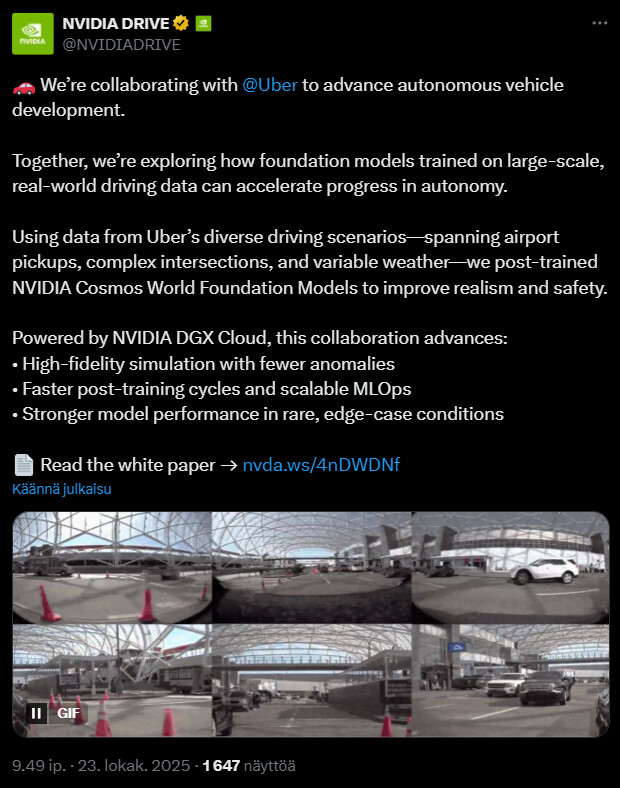 Uber suunnittelee jopa 100 000 robotaksia vuoteen 2027 mennessä. Ne pyörivät Nvidian tekniikalla, mukana on autojättejä kuten esim. Stellantis ja Lucid. Tavoitteena halvemmat kulut, oma datatehdas ja miljoonia ajotunteja mallien koulutukseen yhdessä useiden eri kumppaneiden kanssa. Kasvavaa ja kovaa dominointia tulevaisuudessakin? ![]()