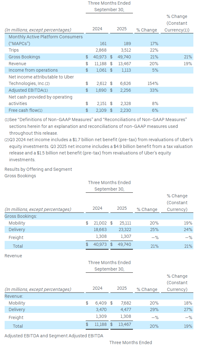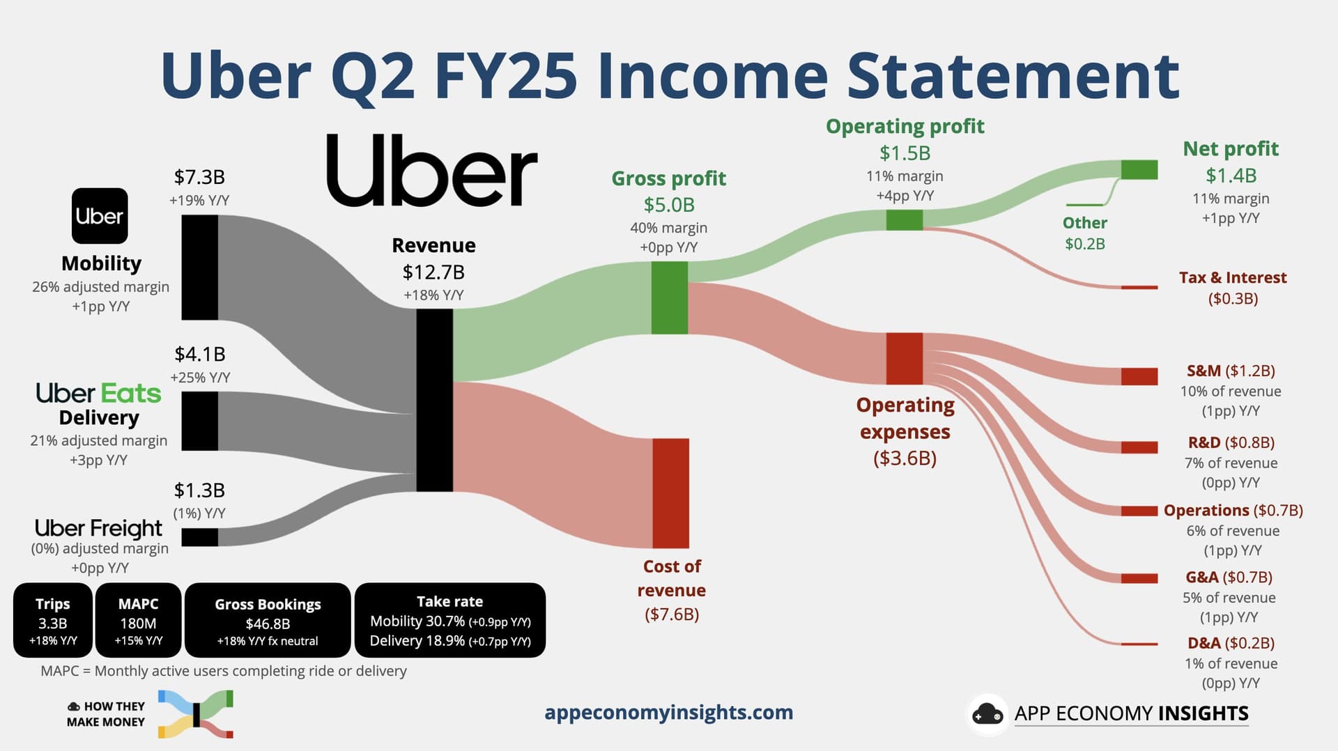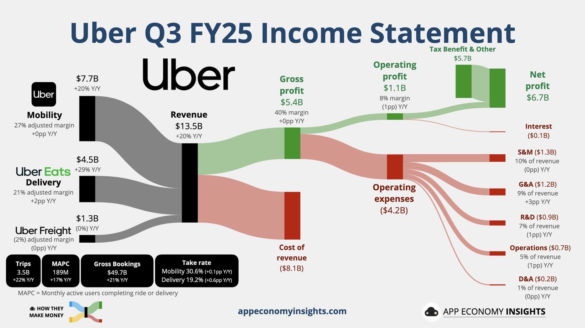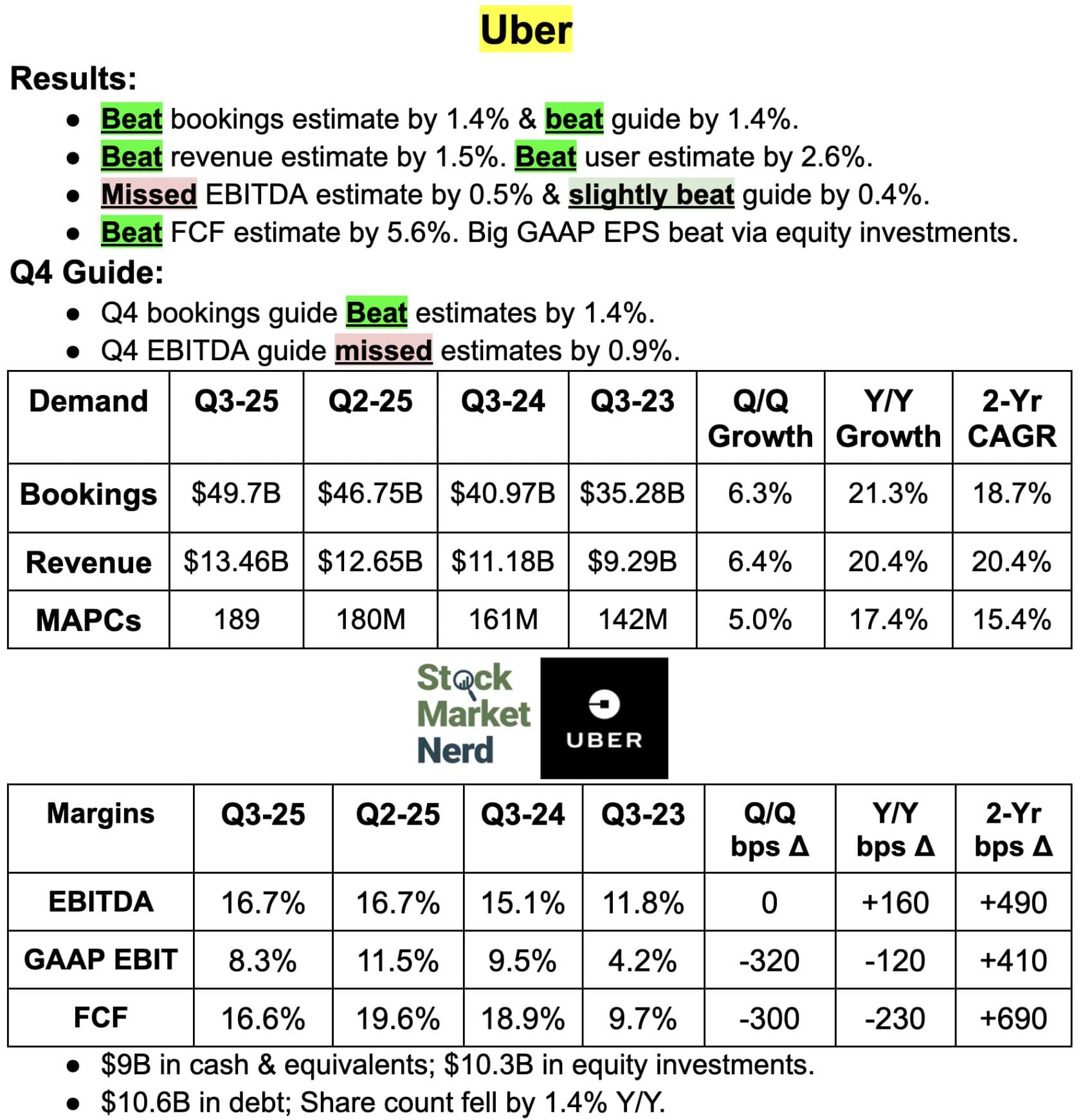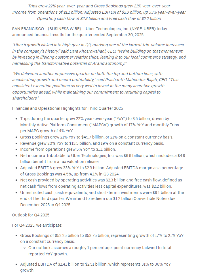 Uberilla meni tämä kvartaali ihan ok; ainakin liikevaihto ja tulos päihittivät odotukset, lisäksi matkustukset ja kuljetukset kasvoivat ripeästi… yhtiö teki myös hyvää kassavirtaa. Toimitusjohtaja kehui kasvun olevan kovassa vauhdissa ja painotti sanoissaan erityisesti panostuksia tekoälyyn + pitkäaikaisiin asiakassuhteisiin, mutta markkinat taisivat vähän pettyä mm. EBITDA:n Q4-ohjeistukseen.