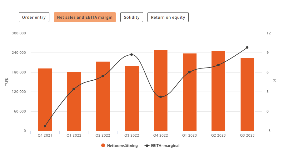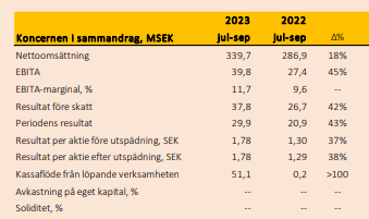 Q3 2023 • Order intake totaled SEK 241.1 (181.3) million, an increase of 33.0 percent. • Net sales for the second quarter were SEK 223.7 (199.2) million, an increase of 12.3 percent, with 11.3 percent constituting organic growth. • EBITA was SEK 21.9 (17.3) million, an increase of 26.7 percent. The EBITA margin was 9.8 percent (8.7). • Earnings per share before and after dilution were SEK 0.77 (0.64). • Cash flow from operating activities was SEK 39.1 (19.5) million. Total cash flow for the period was SEK 27.2 (10.0) million."