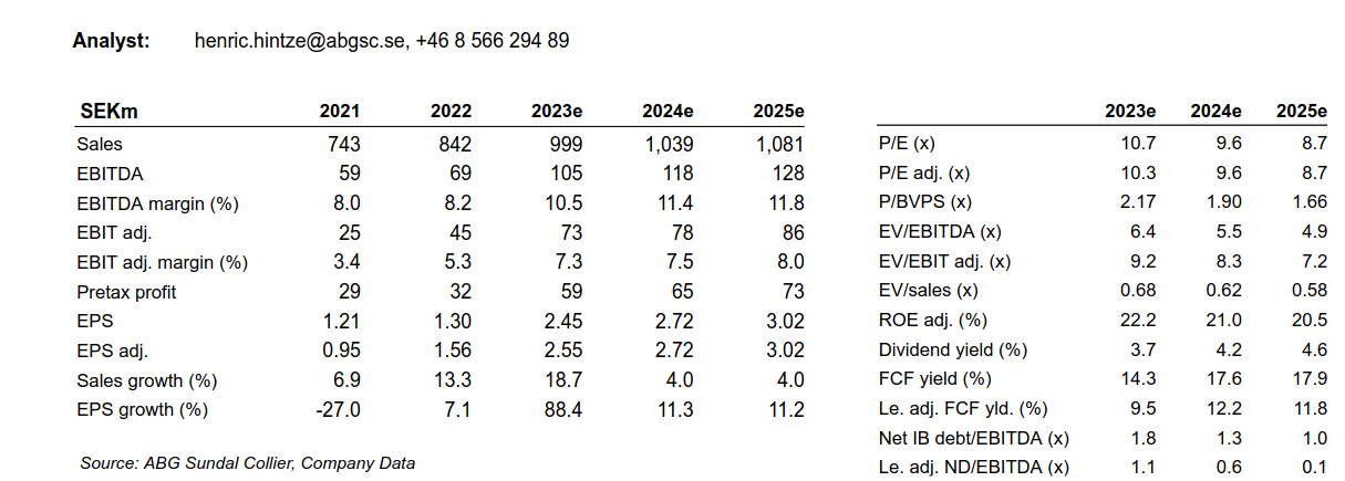Green Landscaping Group (‘GLG’) is a Nordic (Sweden 56% of '22 sales, Norway 38%, Finland and Baltic 5%) serial acquirer that has established itself as a leading player (~5% market share) in the fragmented and steadily growing market for the landscaping and maintenance of outdoor environments. Roughly 60-70% of sales stem from public customers, where contracts are small (SEK 0.5-5m) but generally last for 3-5 years. By acquiring margin- and value-accretive units at 4-6x EBITA, combined with 4% org. sales growth p.a., GLG has through its decentralised M&A model achieved a 42% sales CAGR and a 63% adj. (ABGSCe) EBITA CAGR '18-'22. After a combination of high-margin recently acquired units and improvements in legacy units, GLG delivered rep. EBITA margins of 7.4-8.5% '21-'22, which we expect will reach 9.1-9.5% '23e-'25e.