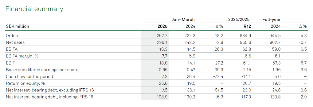 “The restructuring work in the largest company in Technology & Distribution, Christian Berner AB, is advancing well under the new CEO, and we are already seeing improved margins. Finnish Christian Berner Oy, which was the first to feel the economic downturn in the fall of 2023, has started 2025 very well, with strong order intake growth and an EBITA margin of 11 percent. “