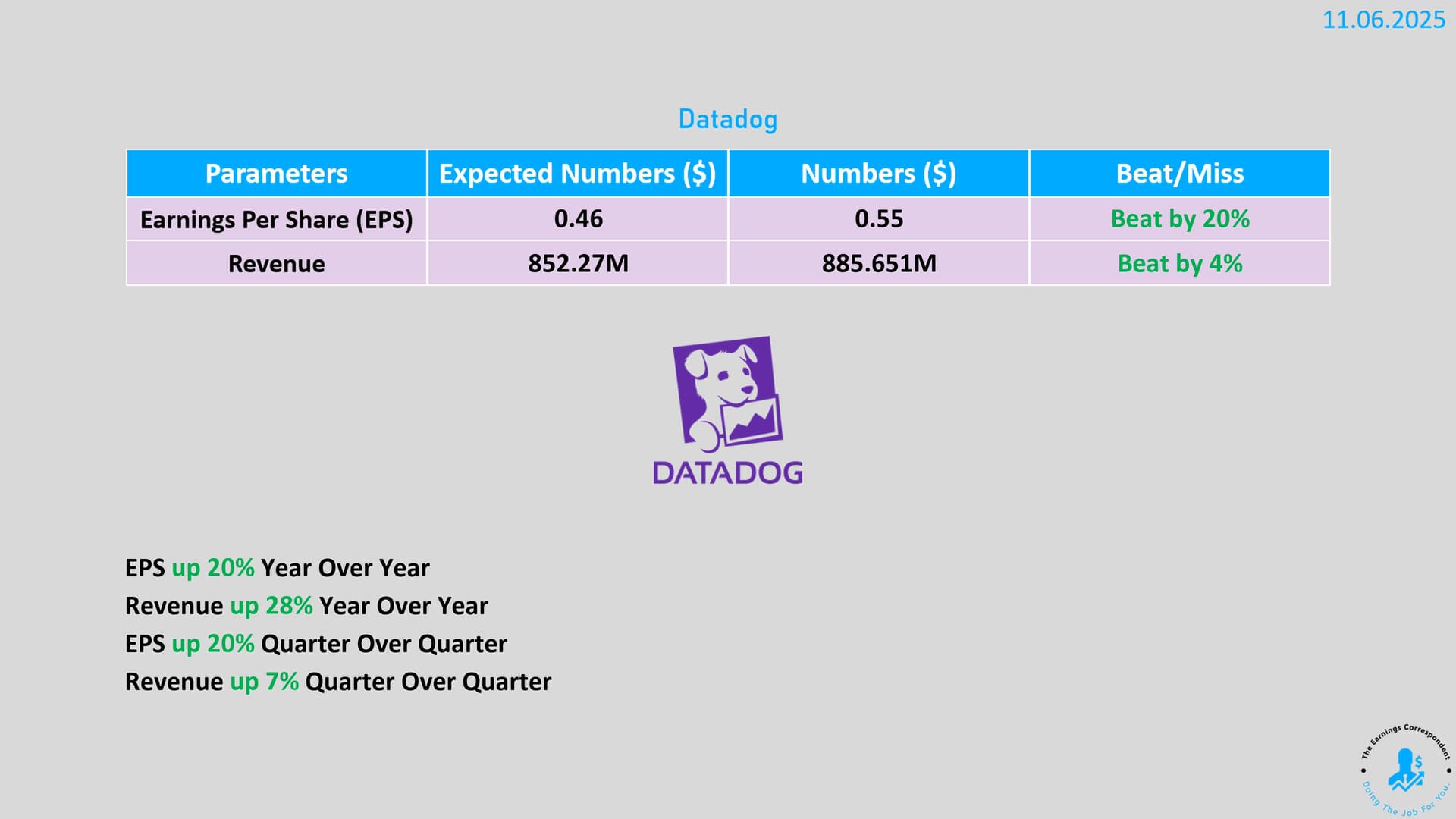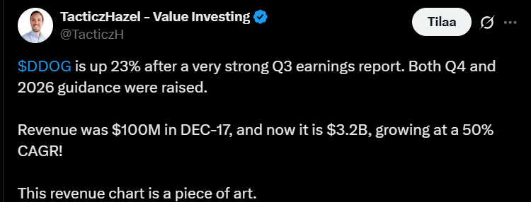 Datadog kasvoi vahvasti; liikevaihto ylitti odotukset, asiakkaita tuli lisää ja muutenkin käyttäjiä on entistä enemmän. Tilauskanta ja laskutus kasvoivat selvästi, ja yhtiö nosti loppuvuoden näkymiään.