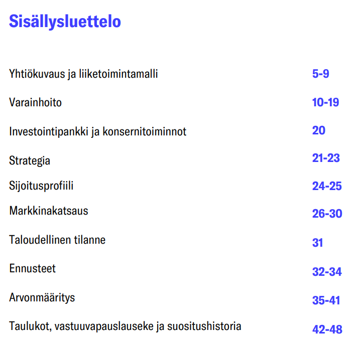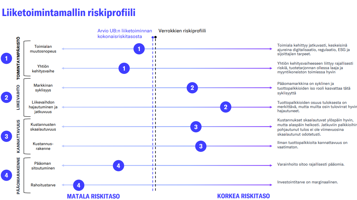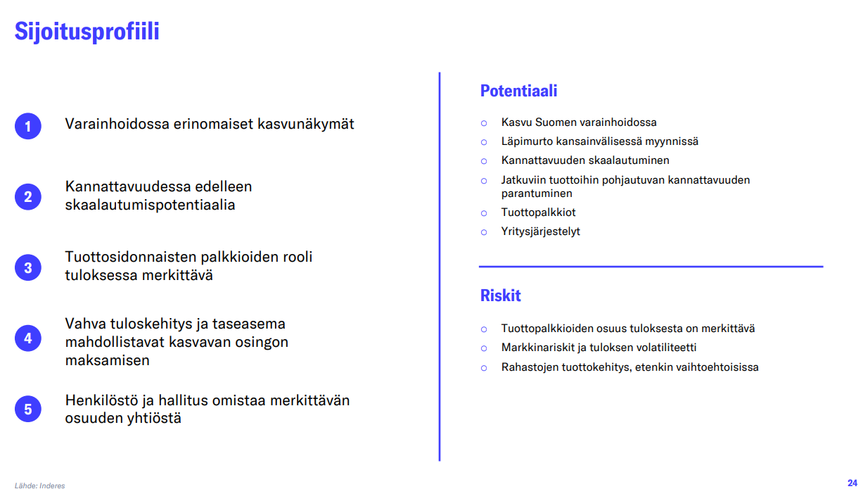 Liiketoiminnan tulosvipu on kiinteästä kulurakenteesta johtuen merkittävä, mikä on heijastunut Varainhoidon viime vuosien lukuihin: vuodesta 2018 vuoteen 2024 asti Varainhoidon liikevaihdon kasvusta noin 50 % on valunut läpi käyttökatteeseen. Taso on mielestämme kohtuullinen, mutta kalpenee sektorin kärkiyhtiöille selvästi, missä tulosvivut ovat olleet 70-100 %:n välillä jatkuvasti. Yhtiön kiinteät kulut ovat kasvaneet jatkuvasti, kun yhtiö on laajentanut tuotetarjontaansa ja kasvattanut myyntivoimaansa. Yhtiöllä pitäisikin olla edellytykset nostaa Varainhoitonsa kannattavuus vielä selvästi nykytasolta, etenkin mikäli tuottopalkkiot säilyvät korkealla tasolla. Tämä korkeampi tulosvipu on mielestämme realismia parin vuoden tähtäimellä, kun yhtiön myynti kiihtyy nykyisestä ja nyt tehtävät kasvuinvestoinnit on tehty.