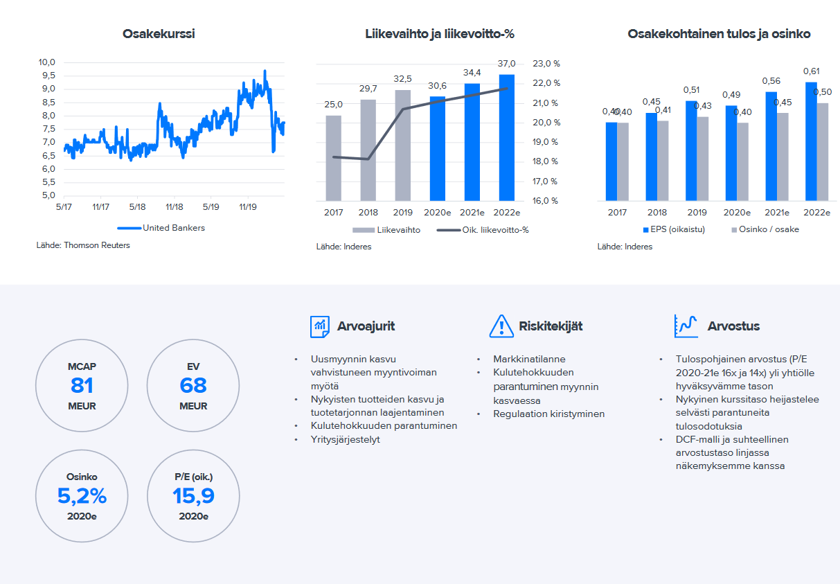 “Yhtiön ensimmäisen vuosipuoliskon tuloskehitys on ollut vahvaa vaikeasta markkinatilanteesta huolimatta. Merkittävä tulosta nostava vaikutus on yhtiön tänään 5.6.2020 tiedottamalla metsärahasto UB Forest Fund I Ky:n metsäomaisuuden myynnillä eurooppalaiseen vakuutusalan konserniin kuuluvalle yhtiölle. United Bankersin tytäryhtiö UB Nordic Forest Management Oy on toiminut rahaston vastuunalaisena yhtiömiehenä. United Bankers kirjaa kaupan seurauksena noin 2,8 miljoonan euron tuottopalkkion vuodelle 2020.”
