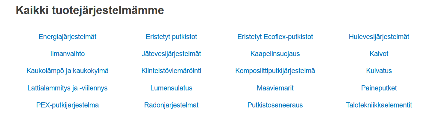 Mielenkiintoista. Valmistaako Wiitta myös putkia vai pelkästään sovitteita? Voiko Wiitan tuotteilla kattaa tyypillisen rakennuskohteen kaikki putkistotarpeet?