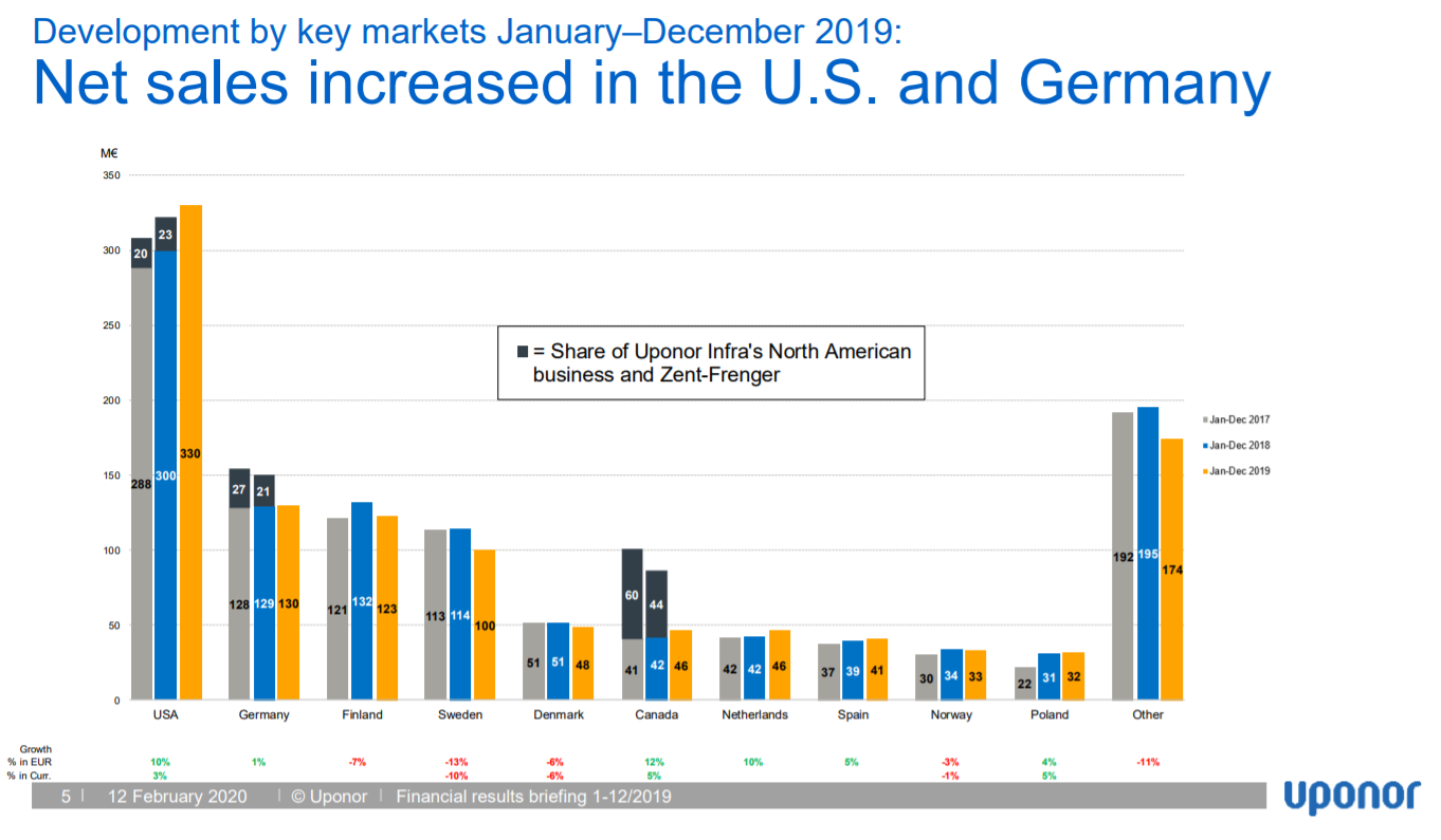 Uponor ei näy otsikoissa; on sijoittajien valtaosalle täysin tuntematon yhtiö. Kuten @Mikko_Rekila yllä toi esiin, Uponor teki varsinkin viime vuoden loppupuoliskolla vahvaa jälkeä USAssa. Näkymä on hyvä alkaneelle vuodelle varsinkin USAssa. Q1/19:n vertailuluvut ovat heikot, joten Q1/20-luvuilta voi odottaa rajua kasvua. Säästöohjelman vaikutus alkanee realisoitua vuoden loppupuoliskolla, minkä myötä marginaalit parantunevat myös Euroopassa. Pitkän aikavälin kasvunäkymä on parempi Pohjois-Amerikassa kuin Euroopassa.