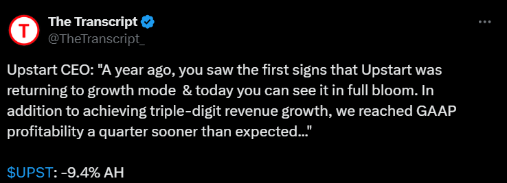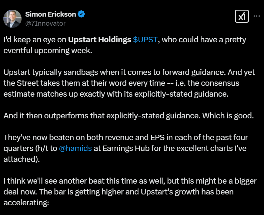 Tviittaajan mukaan Upstartilla voi olla edessä merkittävä viikko, yhtiö on toistuvasti aliarvioinut ennusteitaan ja ylittänyt ne aina myöhemmin. Viimeiset neljä neljännestä yhtiö on ylittänyt sekä liikevaihto- että tulosennusteet. Kasvu on kiihtynyt ja osakkeessa voinee nähdä voimakasta liikehdintää, toisaalta sijoittajat ovat tottuneet siihen, miten yhtiö ylittää ennusteet, että jos alittaa, niin alaspäinkin voidaan mennä lujaa.