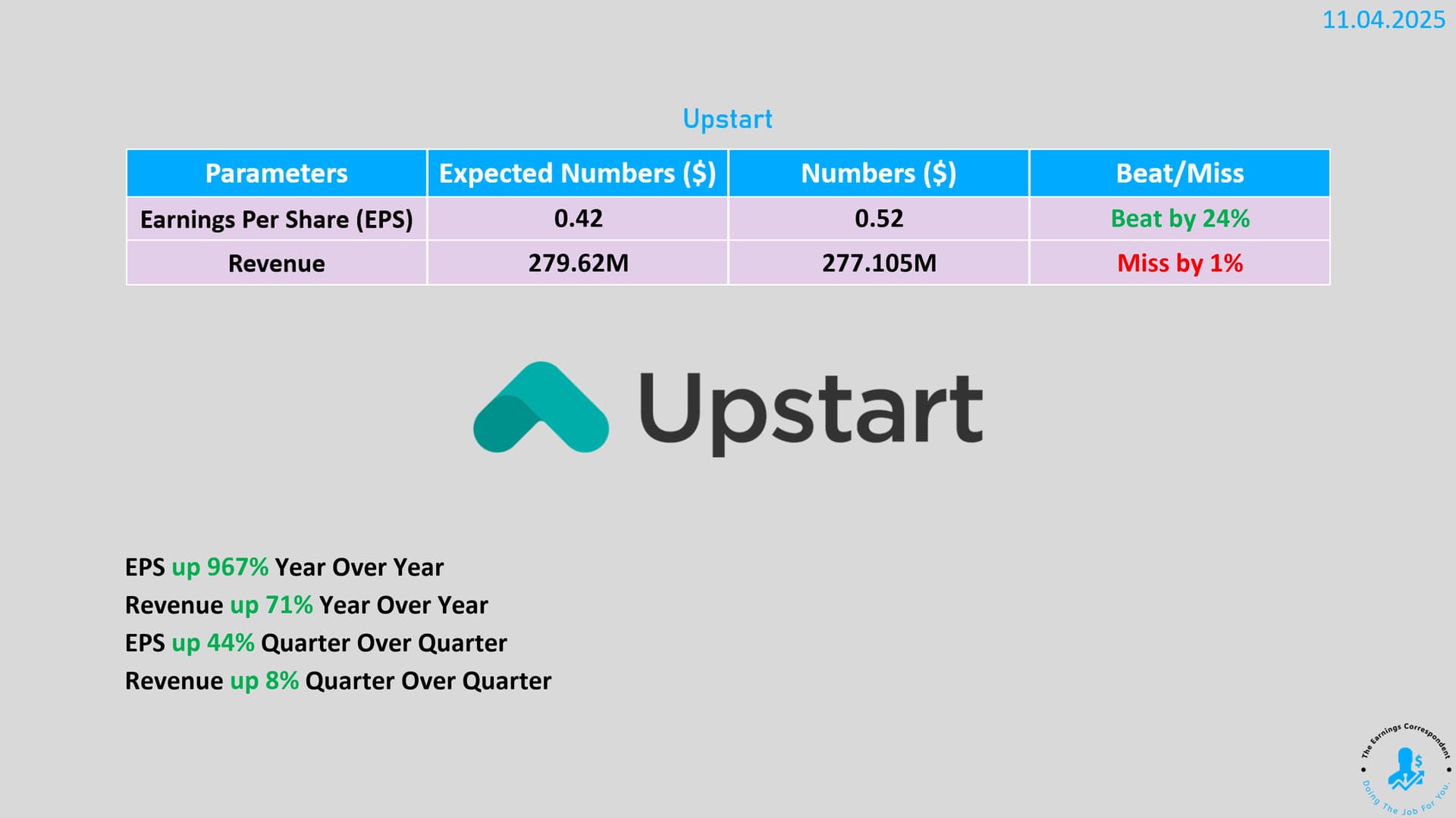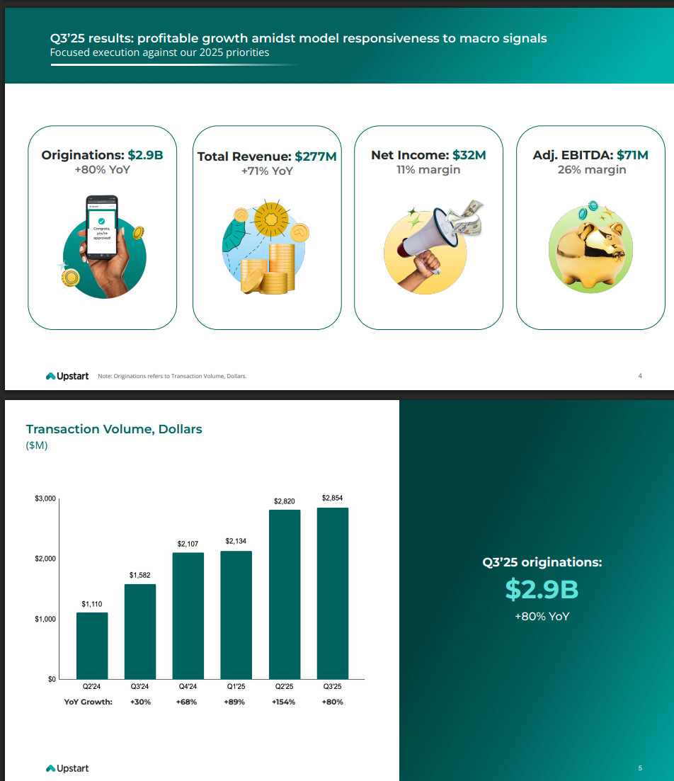Upstartin Q3-tulos osoitti vahvaa kasvua. Yhtiön liikevaihto nousi 162 miljoonaan dollariin, mikä on kaksikymmentä prosenttia enemmän kuin viime vuonna ja kaksikymmentäseitsemän prosenttia enemmän kuin edellisellä neljänneksellä. Palkkiotuotot kasvoivat 168 miljoonaan dollariin, mikä edustaa neljäntoista prosentin kasvua vuodentakaisesta.
