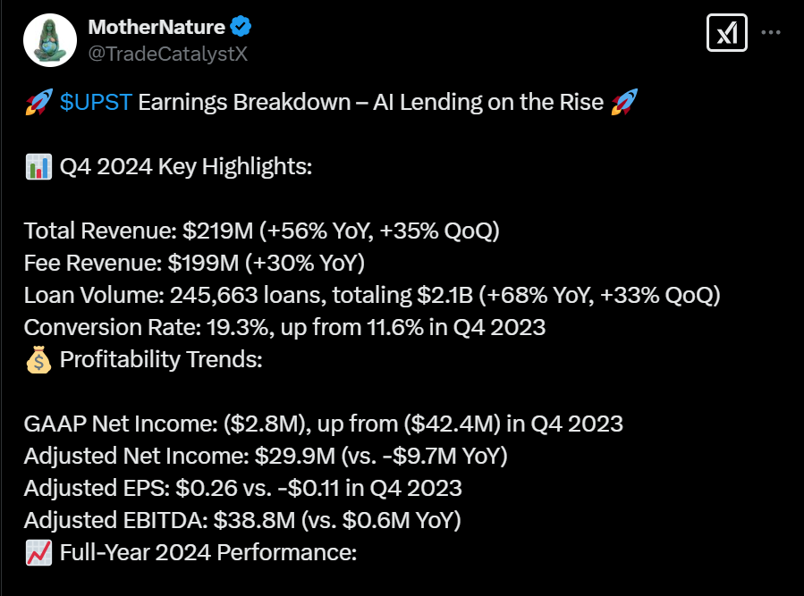 Alla on tviitti, jossa pohditaan Upstartin menoa ja sen tulevaa Q4:sta.