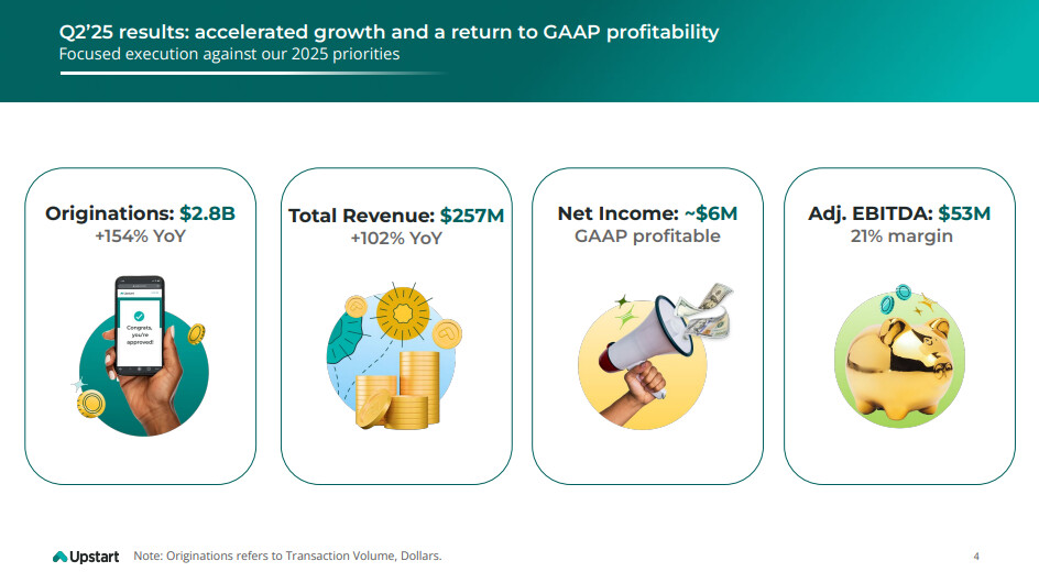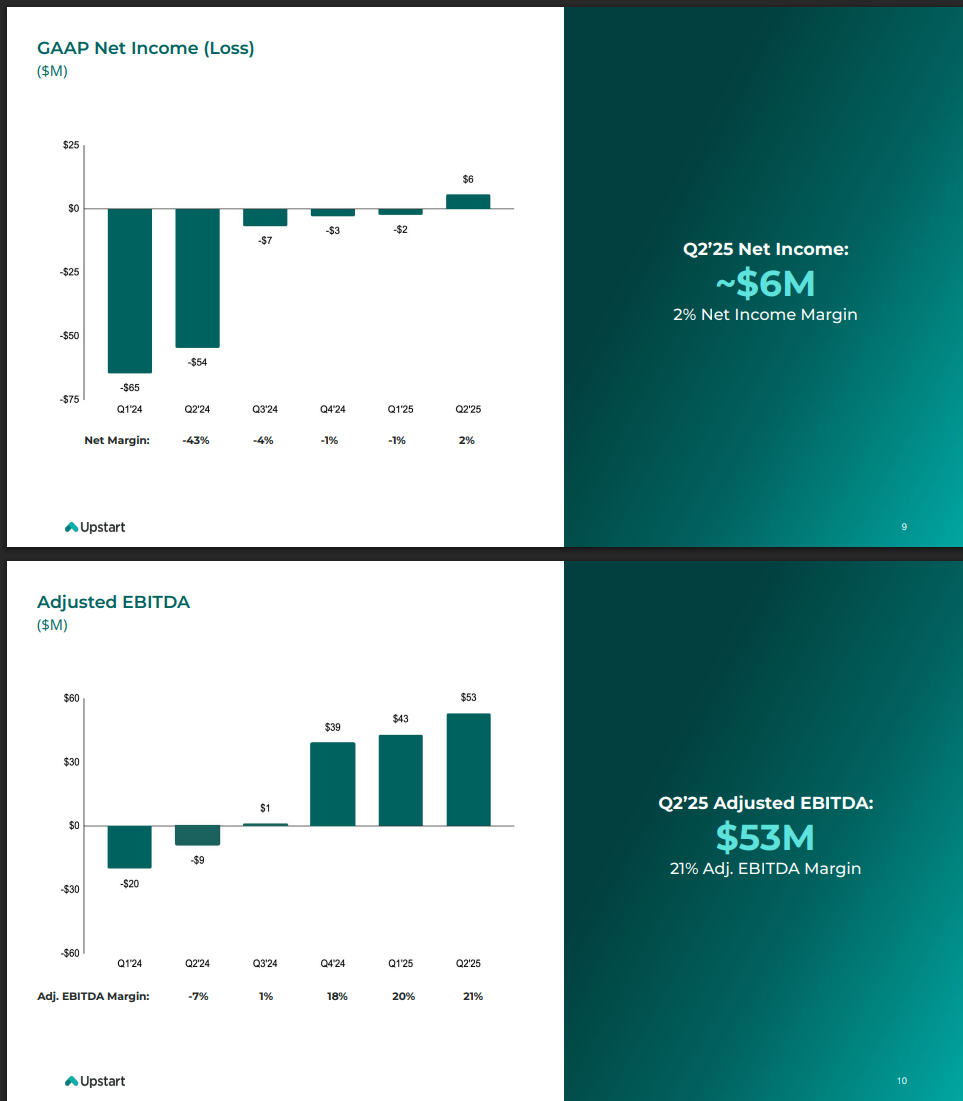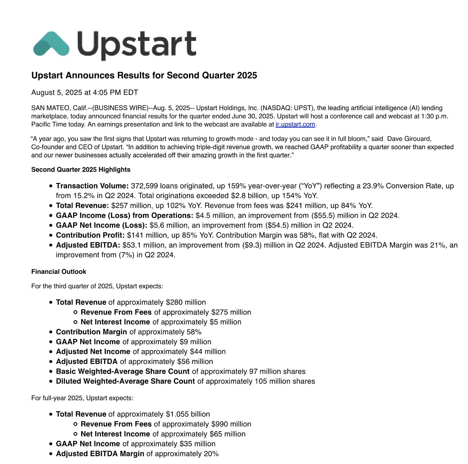 Upstart ylitti odotukset toisella neljänneksellä, jota useammatkin sanoivat ja lisäksi kasvua nähtiin laajasti. Liikevaihto nousi reilusti, lainavolyymit kasvoivat ja yhtiö saavutti ensi kertaa GAAP-voiton, kuten karhulalaisen viestissä todettiin. Myös kannattavuus parani selvästi ja ohjeistus ennakoi positiivista kehitystä loppuvuodelle - pääkohdat kunnossa, eikö? ![]()