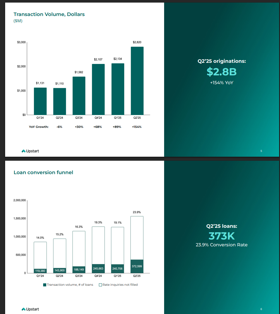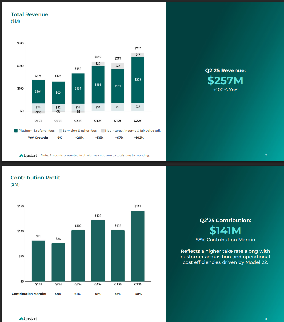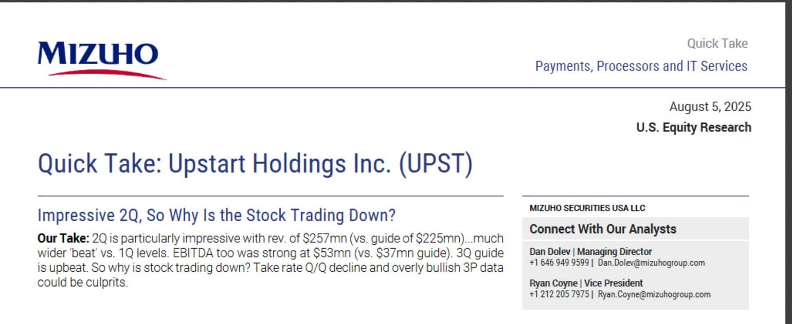 Upstart teki kyllä ihan ookoon kvartaalin, mutta ihan kaikki ei mennyt nappiin. Liikevaihto jäi odotuksista ja yhtiö jopa laski koko vuoden myyntiennustettaan, mikä aika paljonkin himmentää muuten hyviä lukuja ja kovaa lainavolyymien kasvua.