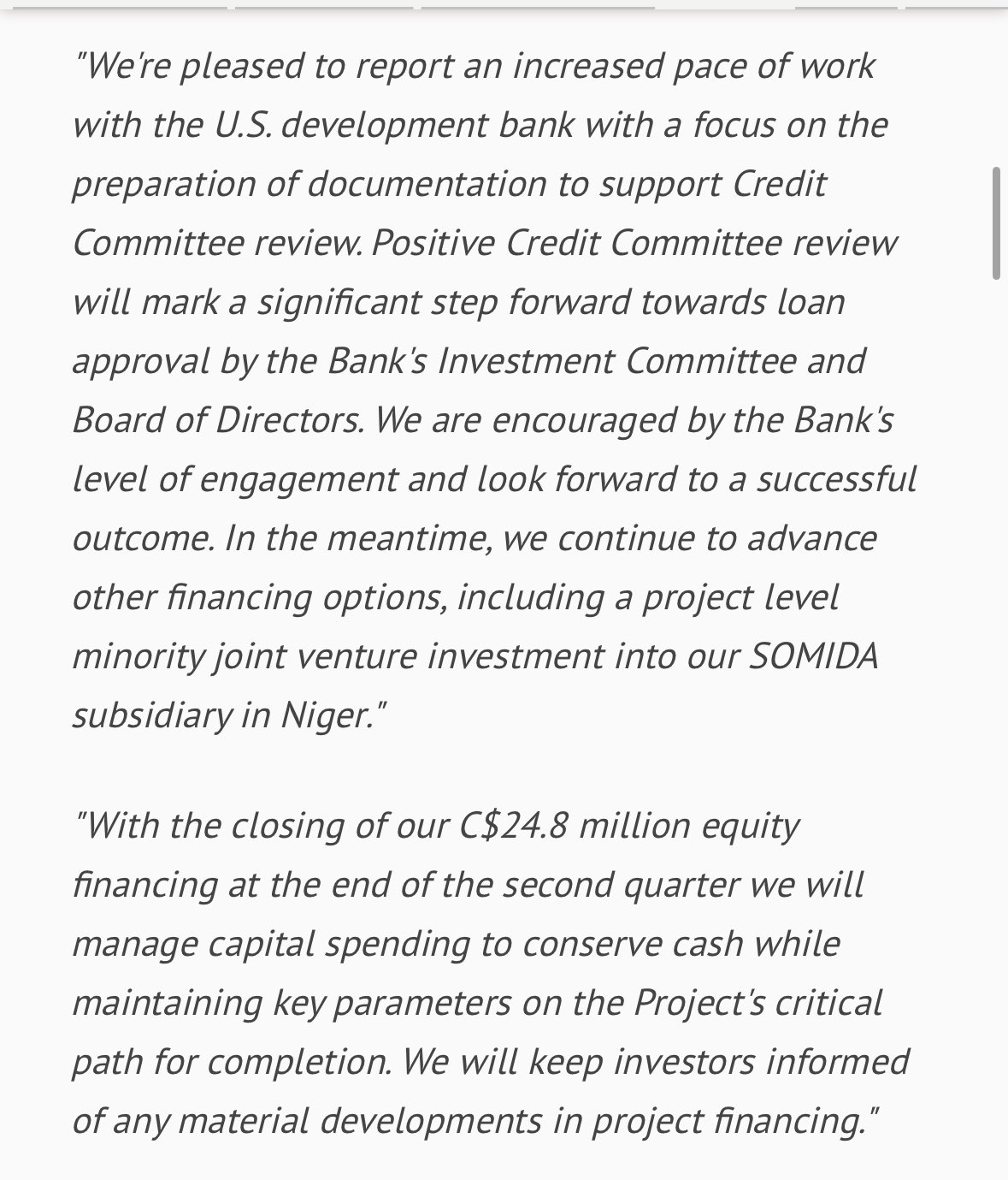 DFCâs management met again after a long break at the end of June and facilitated the progress of several projects, including a mining project in Africa. I would think that trade negotiations with Canada are a bigger reason for this yearâs delays than the junta in the target country. After all, Marco Rubio is the conductor there, and he now acts as a similar puppet for Trump as other influential figures. Trade agreement finalized and in a couple of weeks, a DFC loan to Global, I would guess, I would surmise, I would hopeâŠ