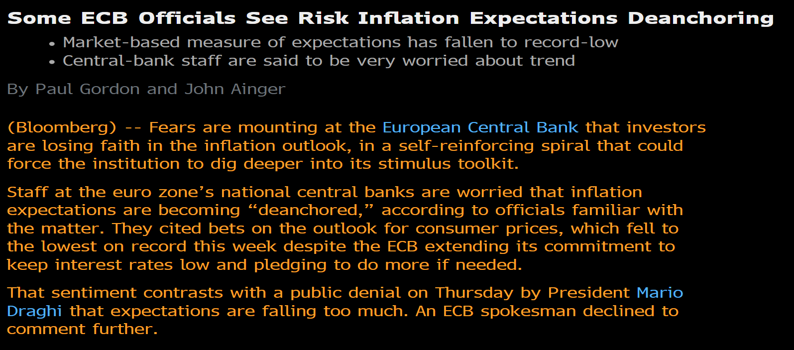 EKP:n “jotkut” virkailijat pelkäävät, että markkina menettää uskonsa inflaatiotavoitteelle, eli markkina “deankkuroituu” siitä: