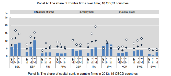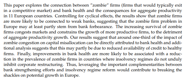 Kiitos oivallisista kommenteista, selitän logiikkaa hieman. Olette oikeassa siitä, että “kaikki” yritykset eivät saa lainaa nollakorolla, mutta zombietaloudessa heikommin tuottavia yrityksiä pidetään hengissä - ja näitä hengityskoneen käynnissä pitäjiä ovat heikot pankit. Pääoman tehottoman allokoinnin seurauksena puolestaan kokonaistuottavuus laskee. Esimerkiksi Euroopan osalta on tehty aiheesta tutkimusta, joista poimin yhden. Sen tiivistelmä on seuraava: