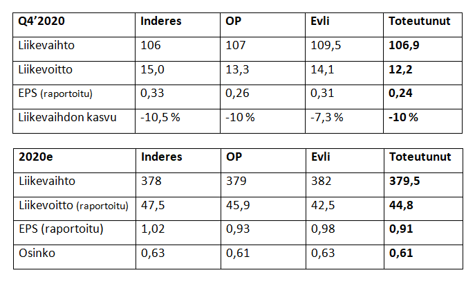 Inderes, OP:n ja Evlin ennusteet ja toteutunut: