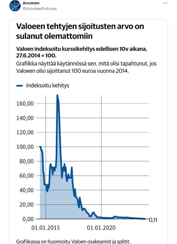 En tiedä mitä saneerausmenettelyyn päästäkseen tarvitaan mutta ihan kaupunkilaisen maalaisjärjellä ajateltuna, yrityksellä pitäisi olla jonkin sortin näyttöjä, että liiketoiminta voisi olla kannattavaa ja sitä Valoella ei ole näyttää…tappiollinen koko historian ajan ja yrityksen pääliiketoimintana ollut pääomistajien rahoitus osakkeita painamalla…miksi Jaatinen (oletettu savolainen) sitten katsoi, että edellytyksiä saneeraukselle on, on epäselvää (ehkäpä näkee lypsylehmänä tämän kuten pääomistajat?).