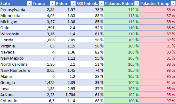 Laitoin Exceliin molempien kandidaattien kerrointopit jokaisesta “swing statesta”, ja 538:in todennäköisyyden Bidenin voitolle. Oli hauska nähdä, että tällä kaavalla Bidenin jokaisen osavaltion voitosta lyöminen antaisi positiivisen odotusarvon. Näistä valitsin kuitenkin vain parhaat, ja löin vetoni Pennsylvanian, Minnesotan, Michiganin ja Ohion voitosta.