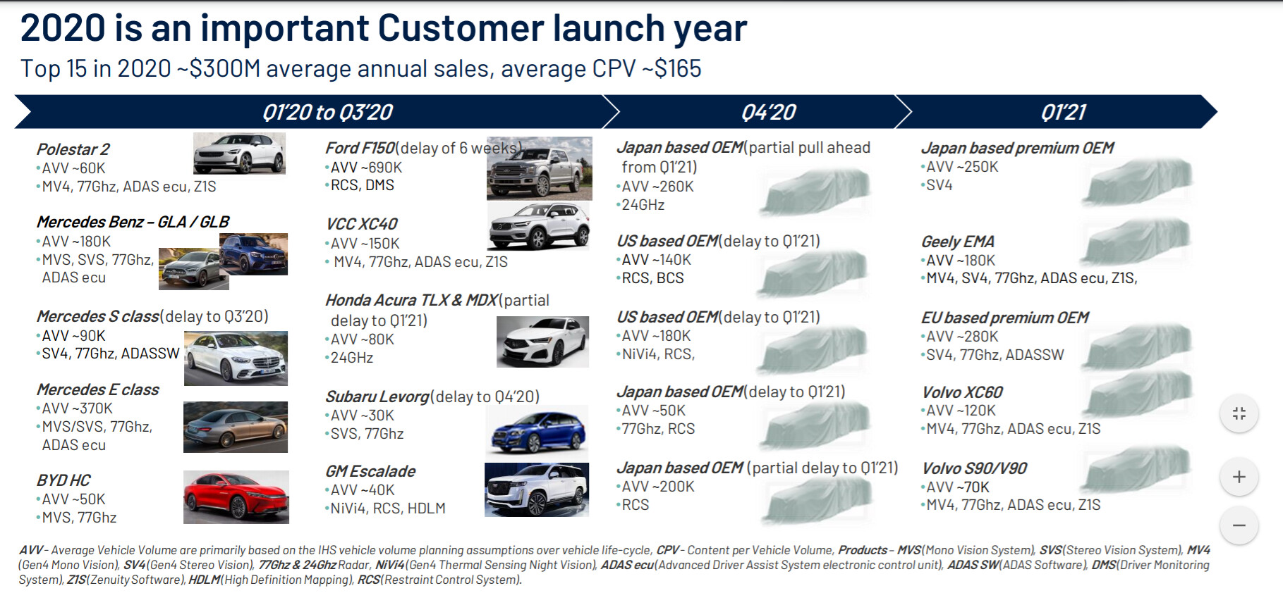 Oheisessa aikataulussa tuo lämpökamerajärjestelmä on lyhenteellä NiVi4. Escalade on nyt päässyt tuotantoon ja Q1 2021 aikana julkaistaan toinen automalli, johon sama järjestelmä on tulossa. Tuo vielä nimeämätön malli on selvästi suuremman volyymin malli kuin Escalade.