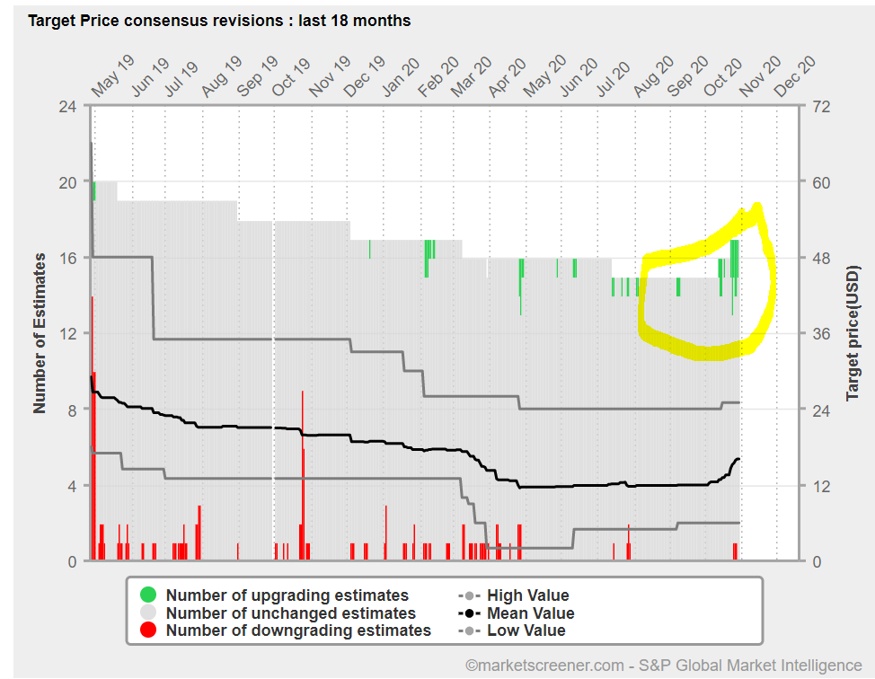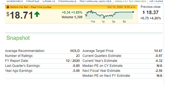 Kuten Mikko totesi, myös analyytikot ovat heränneet. Räppäsin kuvakaappauksen MarcetWatchin sivuilta 13.10-20. Keskimääräinen tavoitehinta 23 analyytikon parvista oli 14.47 $ - pidä.