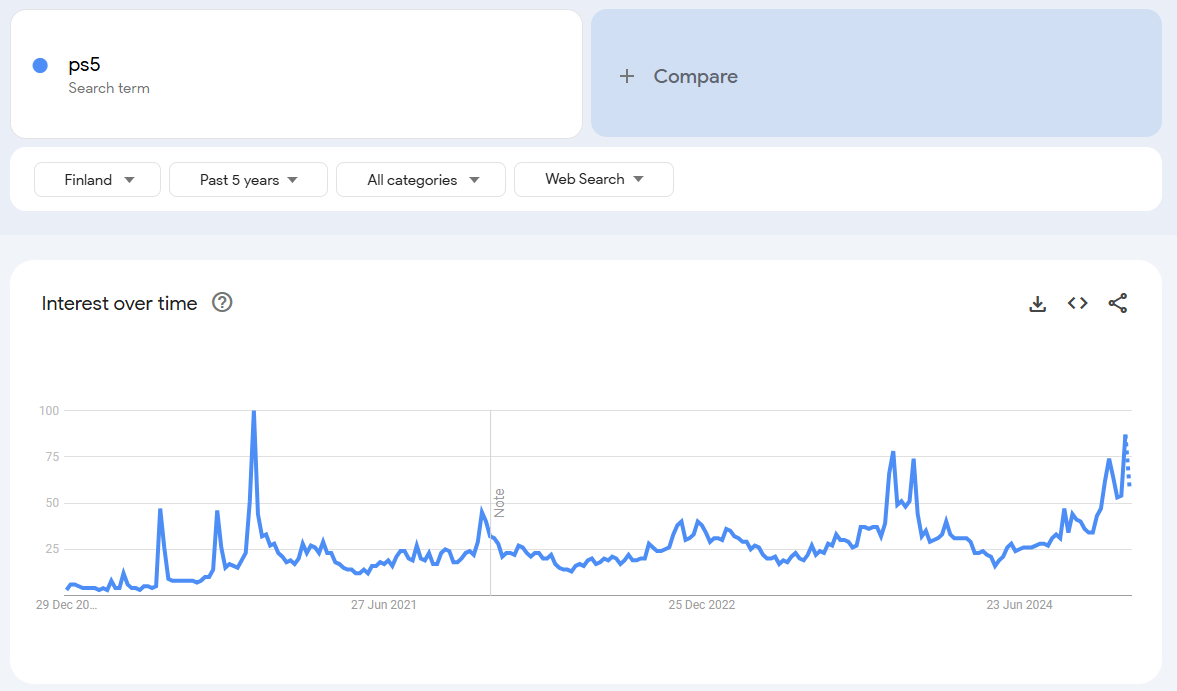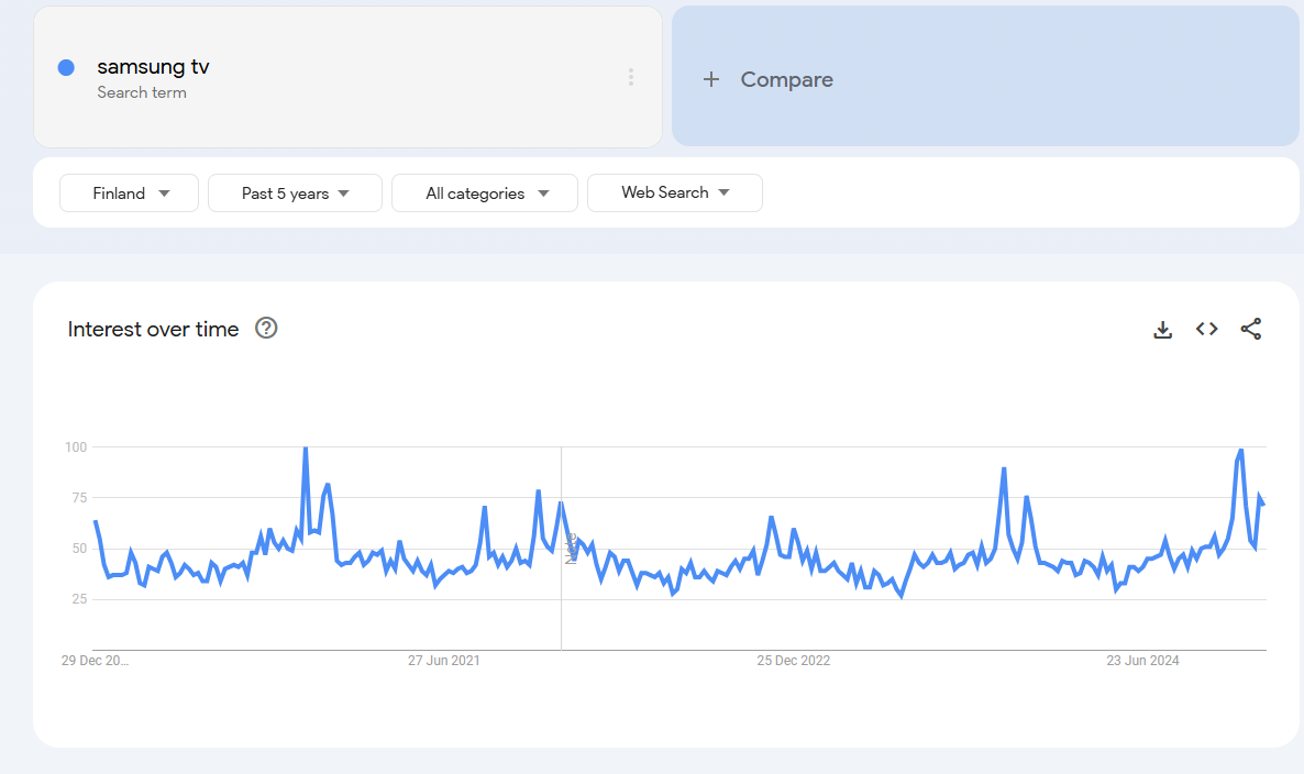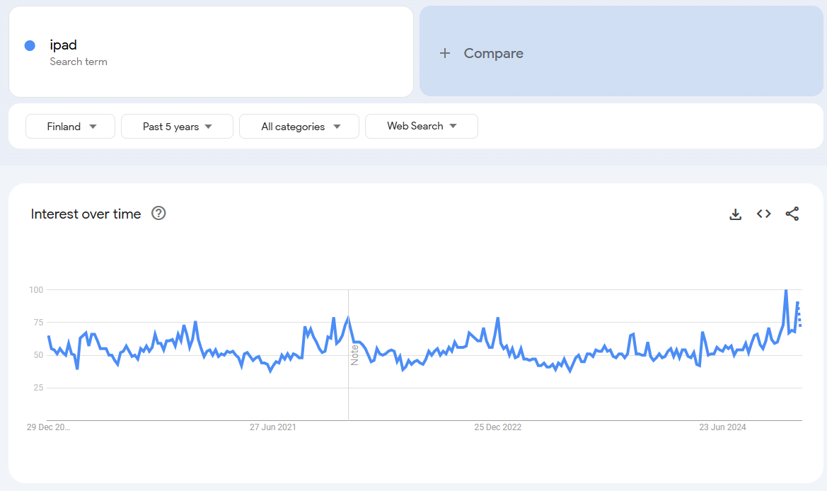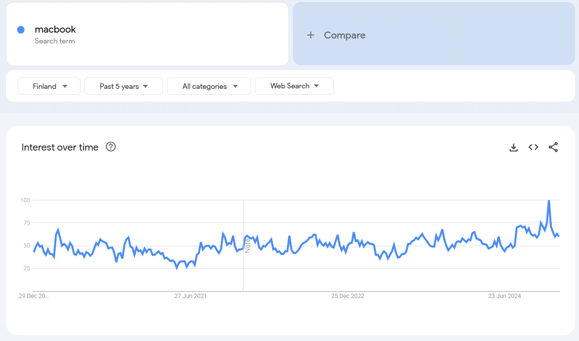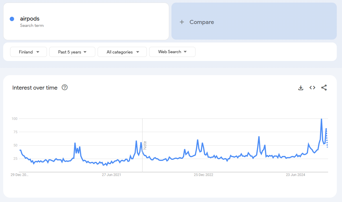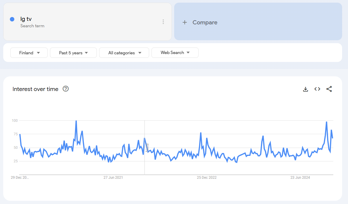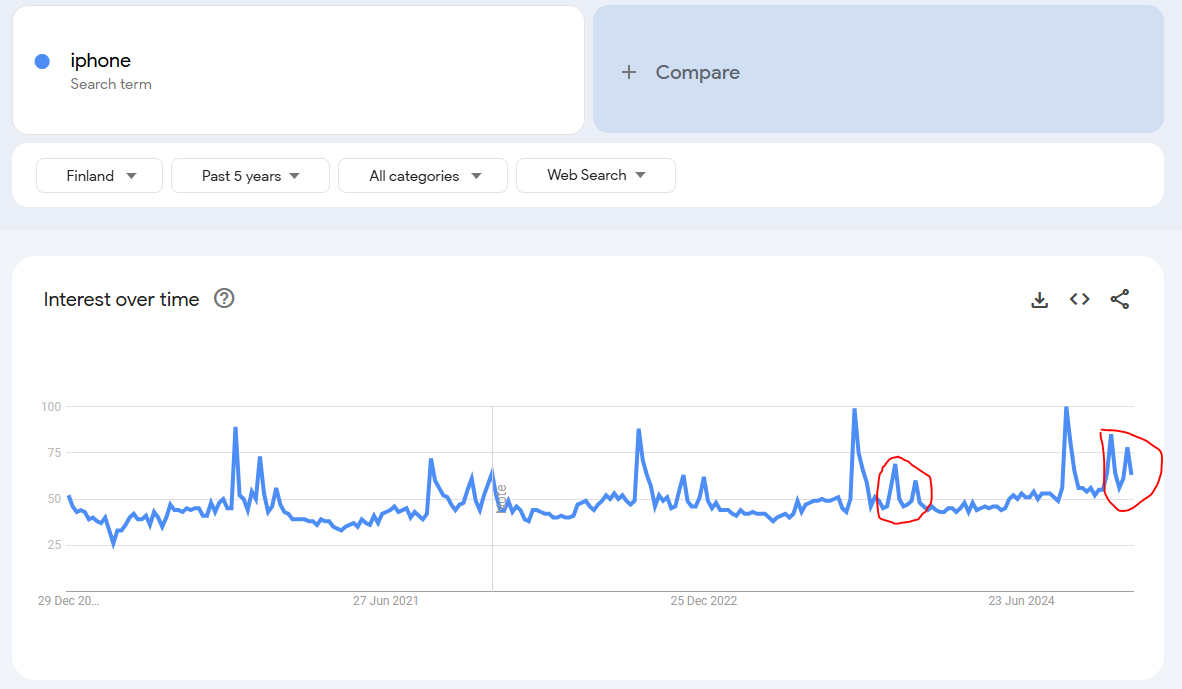 Katselin jälleen kerran Google Trends dataa ja alkuvuosi näyttää samaa trendiä kuin Q4 loppu. Todella isoa kasvua kiinnostuksesta avainsanoilla: iphone, samsung tv, lg tv, airpods, macbook, kannettava tietokone, läppäri, ps5, robotti-imuri.