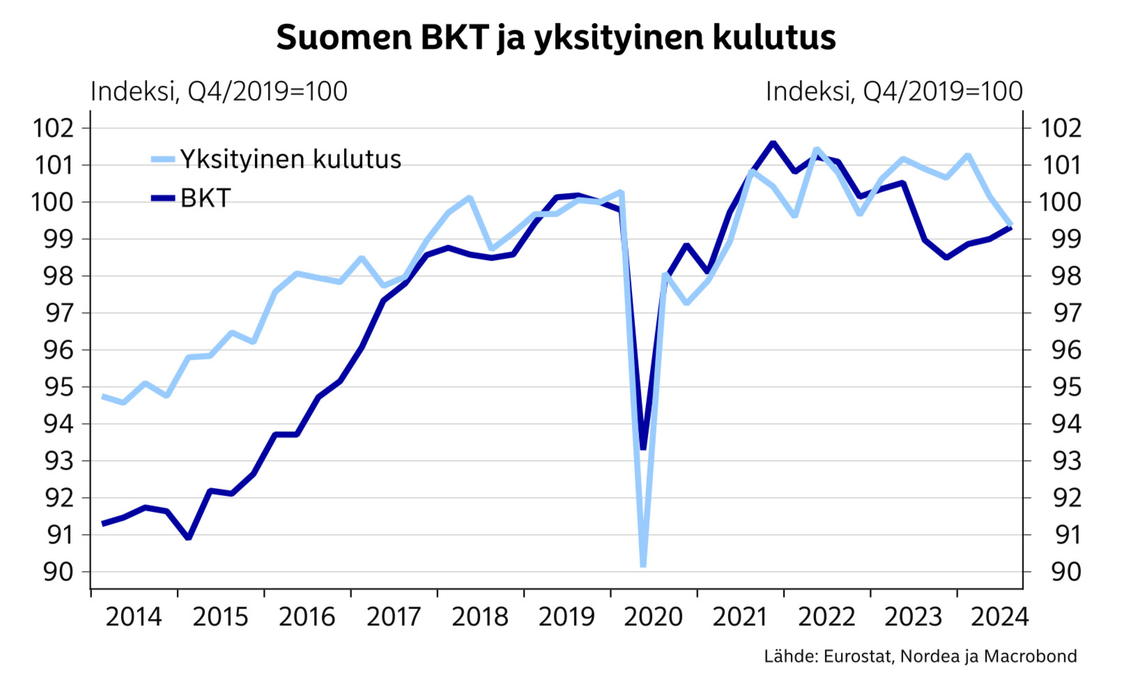 Näen myös positiivisena merkkinä sen, että vuotta aiempaan verrattuna suomalaisten talletuskanta on noussut oikeastaan koko viime vuoden jälkipuoliskon. Eiköhän se sieltä hiljalleen purkaudu myös kulutukseksi, kun elämä ei enää entiseen tapaan ole säästöjen syömistä. Kun lainojen korot laskee kovaa vauhtia, ja sähkössäkää ei olla enää nähty hirmupiikkejä, sitä ostovoimaakin kertyy ihan mukavasti monille kotitalouksille.