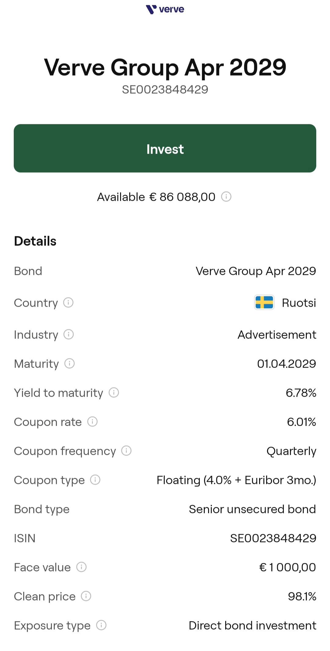 I happened to come across that it’s possible to acquire Verve bonds through Mintos at 4% + 3-month Euribor. Mostly in case any owner might be interested. Minimum subscription €50. Not investment advice…