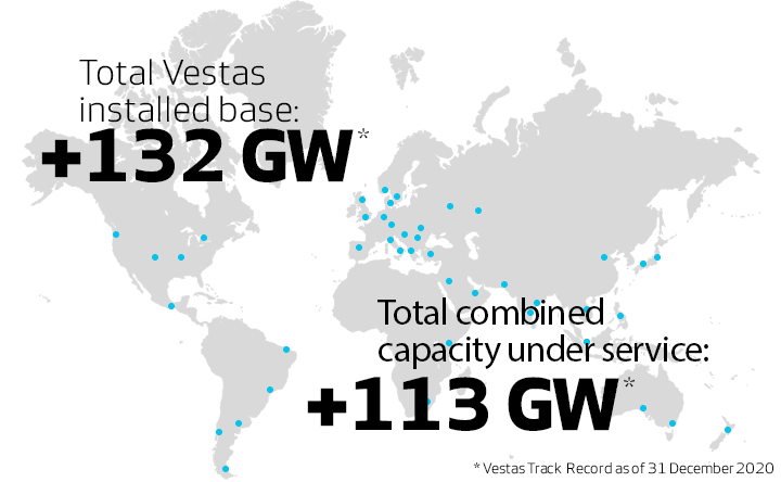 Nyt asennettu kapasiteetti on +132 GW ja huoltosopimus +113 GW. Maailmanlaajuisesti asennettu kapasiteetti on ~650 GW, eli asennetusta kapasiteetistä Vestasin osuus on 17%. Onshore asennuksissa Vestas on tällä hetkellä markkinajohtaja ja offshore asennuksissa toiseksi isoin.